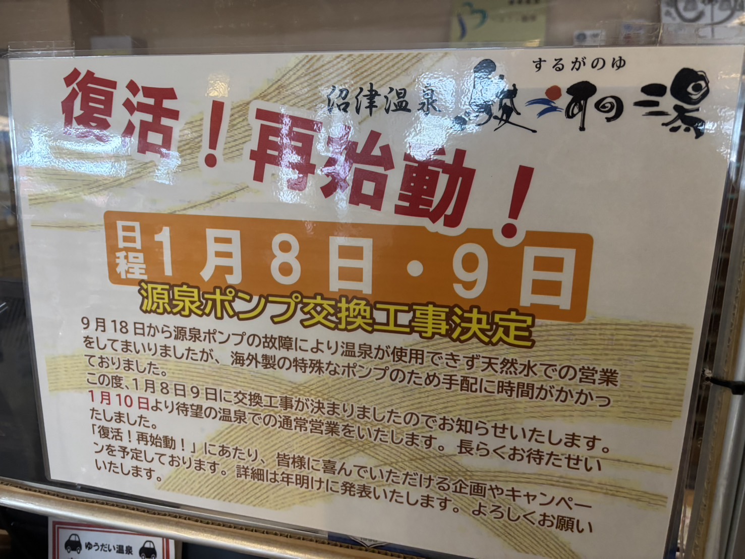 源泉ポンプ交換工事を1月8日・9日にするみたいってことは、昨年12月にぬまつーでもお伝えしましたが、