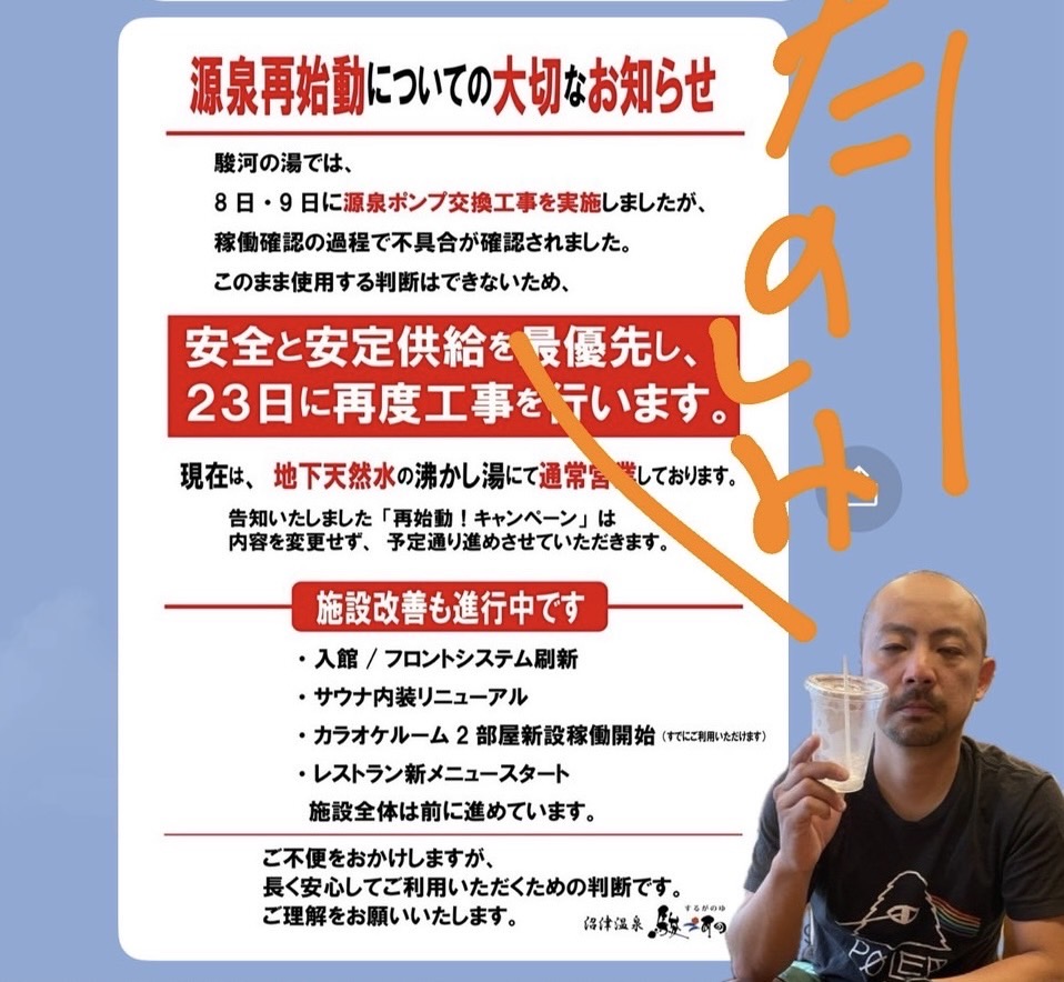 【大切なお知らせ|源泉再始動について】いつも駿河の湯をご利用いただきありがとうございます。8日・9日に源泉ポンプ交換工事を実施いたしましたが、稼働確認の過程で不具合が確認されたため、安全と安定供給を最優先し、23日に再度工事を行う判断をいたしました。現在は地下天然水の沸かし湯にて通常営業しております。ご入浴・館内利用に制限はありません。なお、・入館/フロントシステム刷新・サウナ内装リニューアル・カラオケルーム2部屋 新設稼働・レストラン新メニュースタートなど、施設全体の改善は進行・稼働中です。告知しております「再始動!キャンペーン」も内容を変更せず、予定通り実施いたします。ご不便をおかけしますが、長く安心してご利用いただくための判断です。ご理解のほど、よろしくお願いいたします。