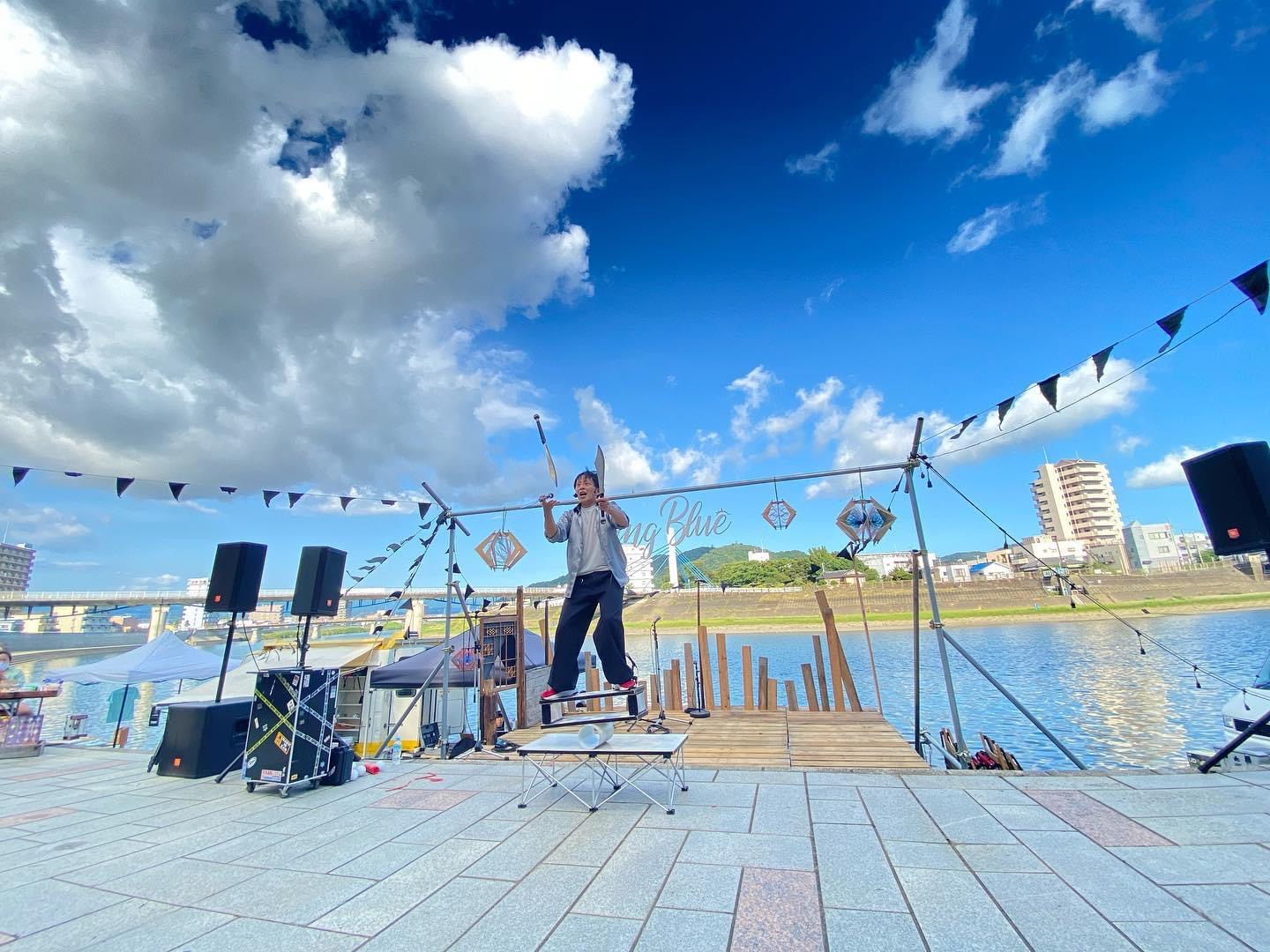パフォーマー信号さんの大道芸。狩野川をバックにハラハラドキドキ。めっちゃかっこよかった。写真はこもりん@ぬまつー撮影。