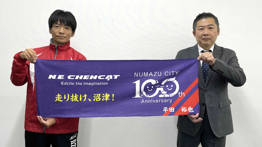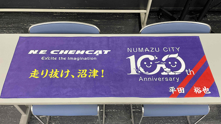 さらに、別の日には一本松にあるエヌ・イー ケムキャットという会社がチームに応援タオルをプレゼント。ユニホームと同じ紫色のタオルには100周年ロゴもあしらわれていて、「走り抜け沼津!」の力強いメッセージが。