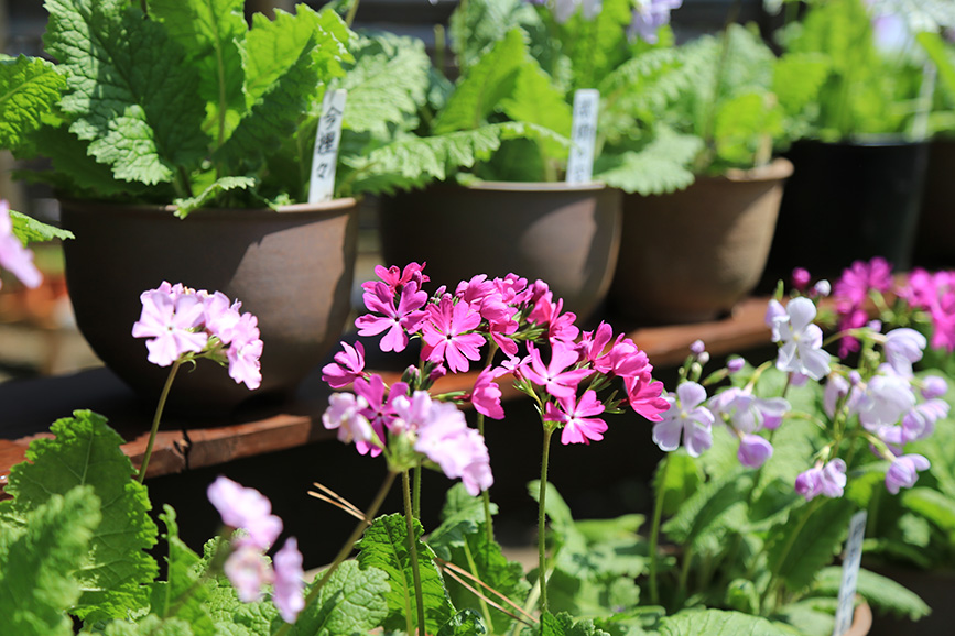 園内の様々なところに鉢植えの桜草がズラリと並び、春らしさを演出しています。
