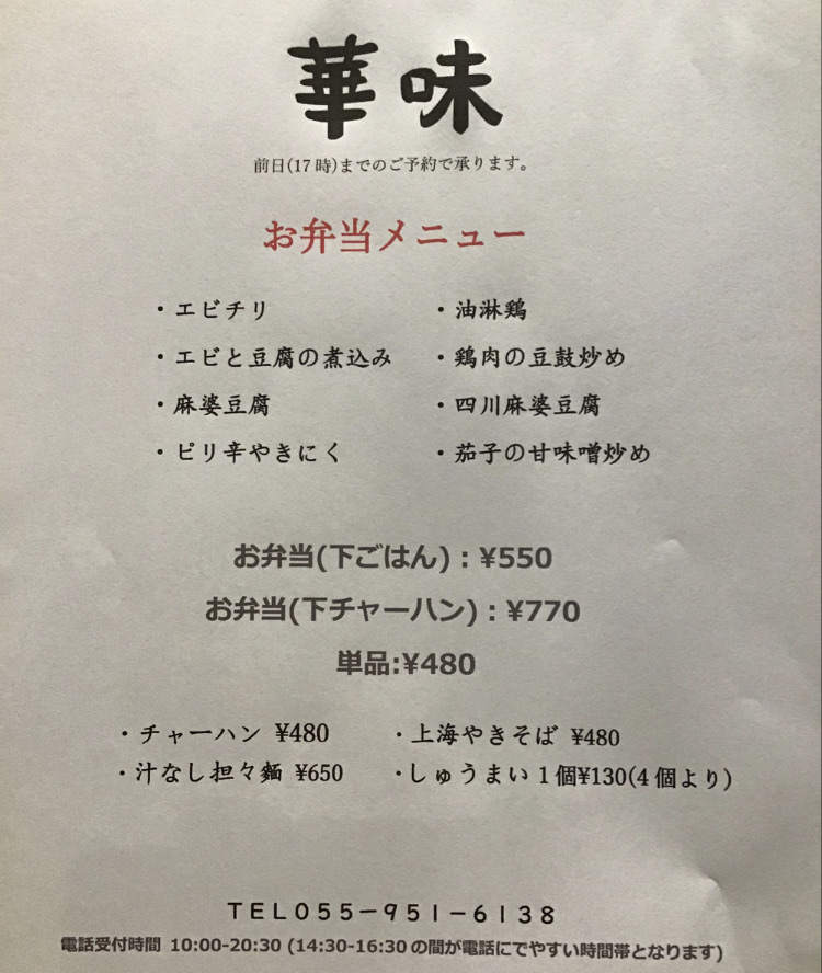 レギュラーメニュー以外(950円のお弁当・定食類のお弁当)は前日予約。