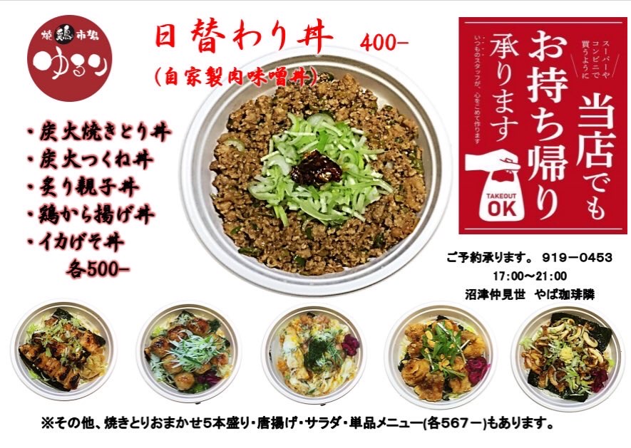 テイクアウト可能 平日16時〜20時 定休日:日曜日 https://tabelog.com/shizuoka/A2205/A220501/22018231/