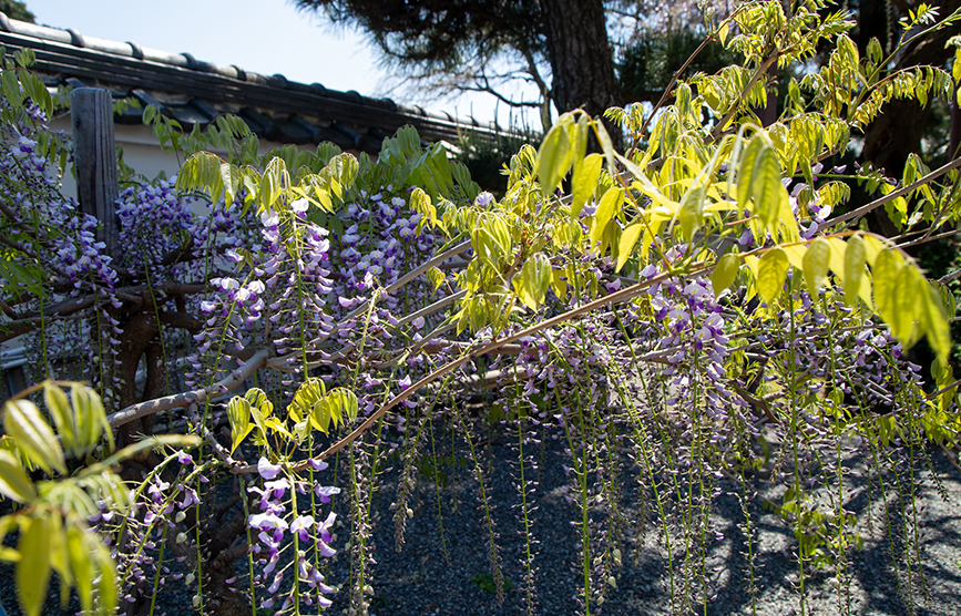 すっとしだれ落ちる藤の花。やや蕾の部分もあるのであと3日もすれば満開でしょうか(4月10日撮影)。