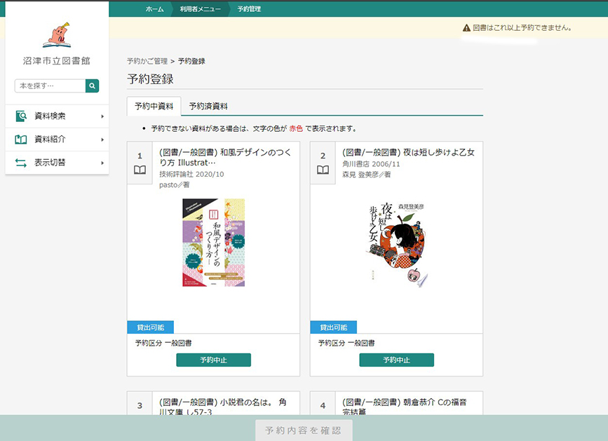 早速利用しましたが、予約できるのは5冊まで。要注意!6冊以上予約しようとすると、さっぱり反応してくれませんでした。欲張らないようにしましょう。