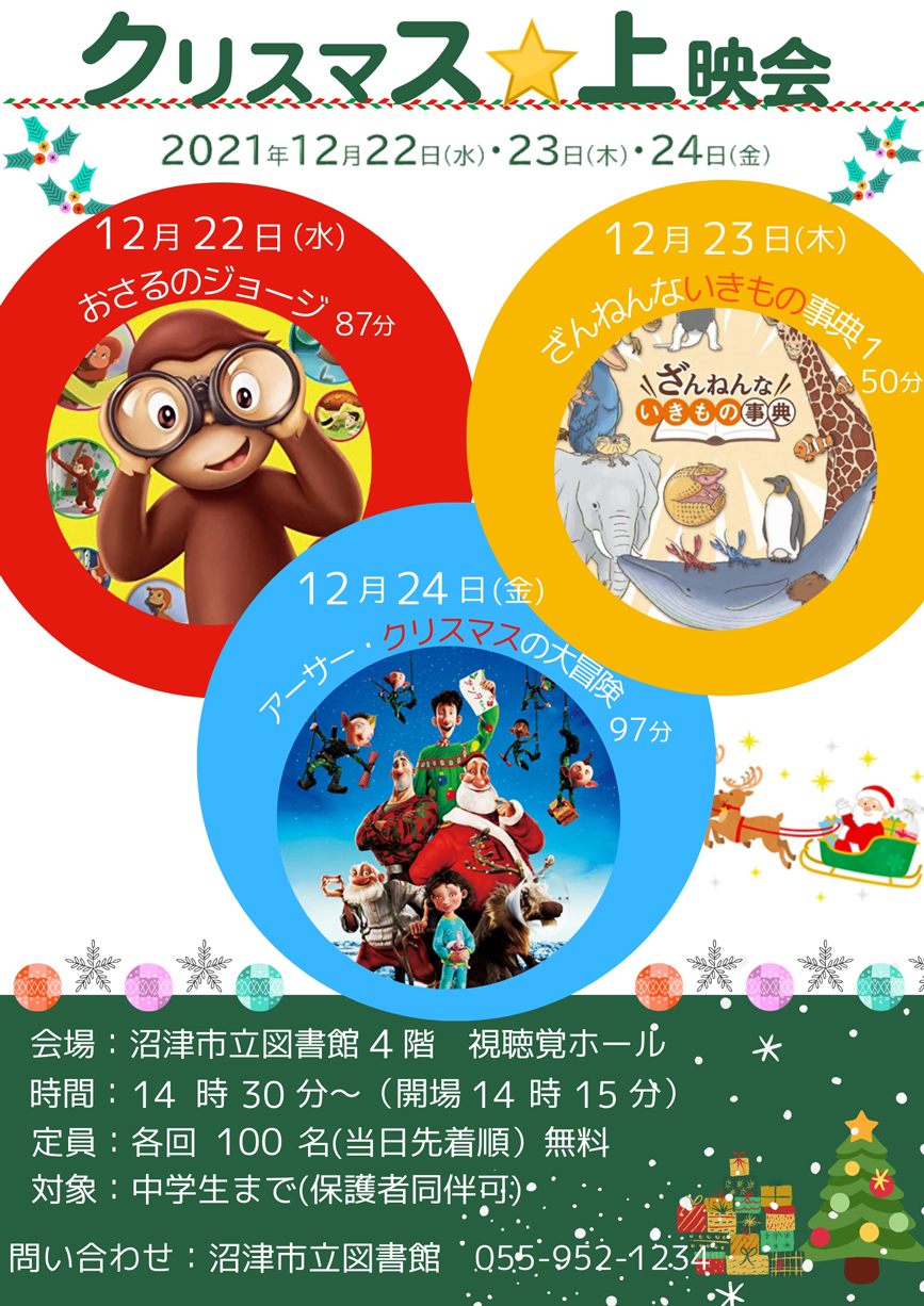 沼津市立図書館でクリスマス上映会開催!ざんねんないきもの事典とかおさるのジョージとか。