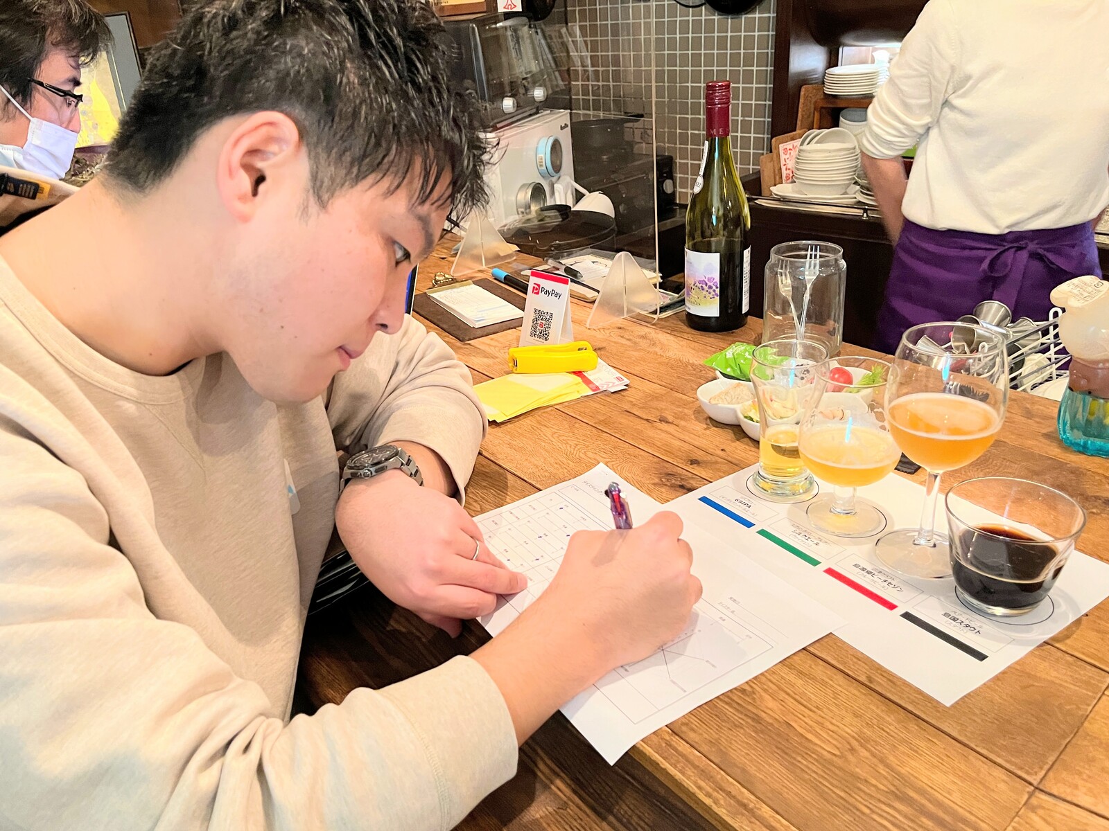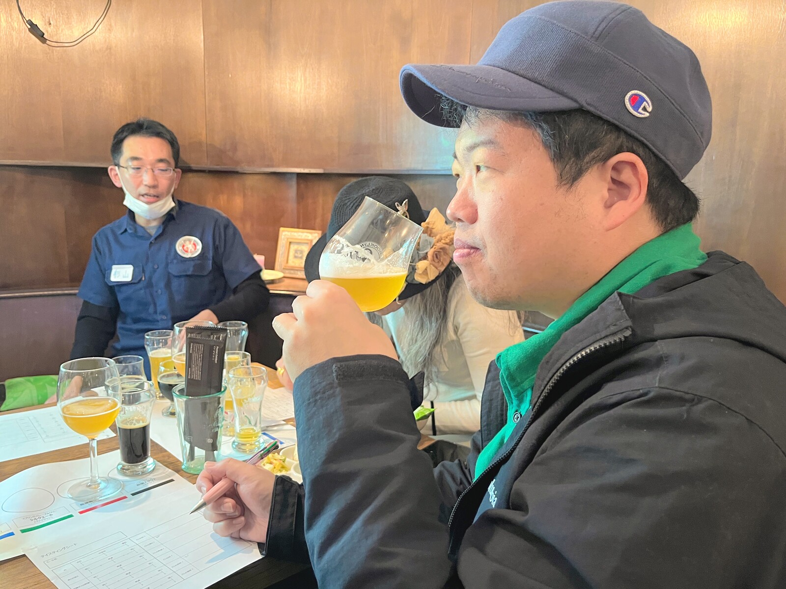色、香り、苦味、後味などをメモ。「言葉にするのが難しい...」とつぶやくお兄さん。