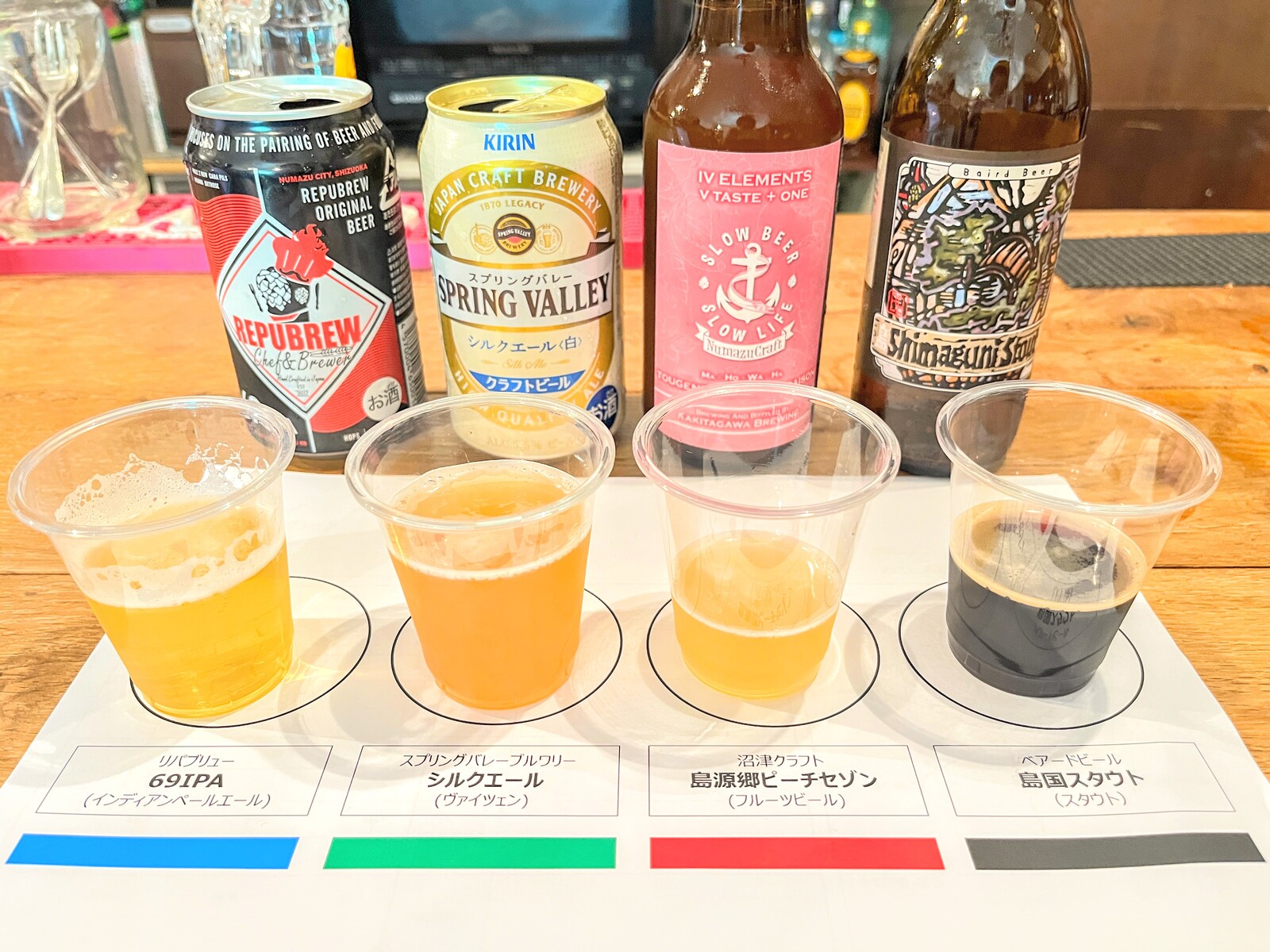 左から69IPA、シルクエール、島源郷ピーチセゾン、島国スタウト。
