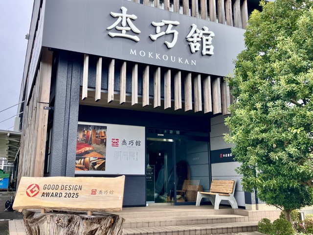 杢巧舘入口には、2025グッドデザイン賞受賞の一枚板が。