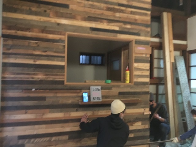 入ってすぐの左の壁。古材を使っていてカッコいいので要チェック。