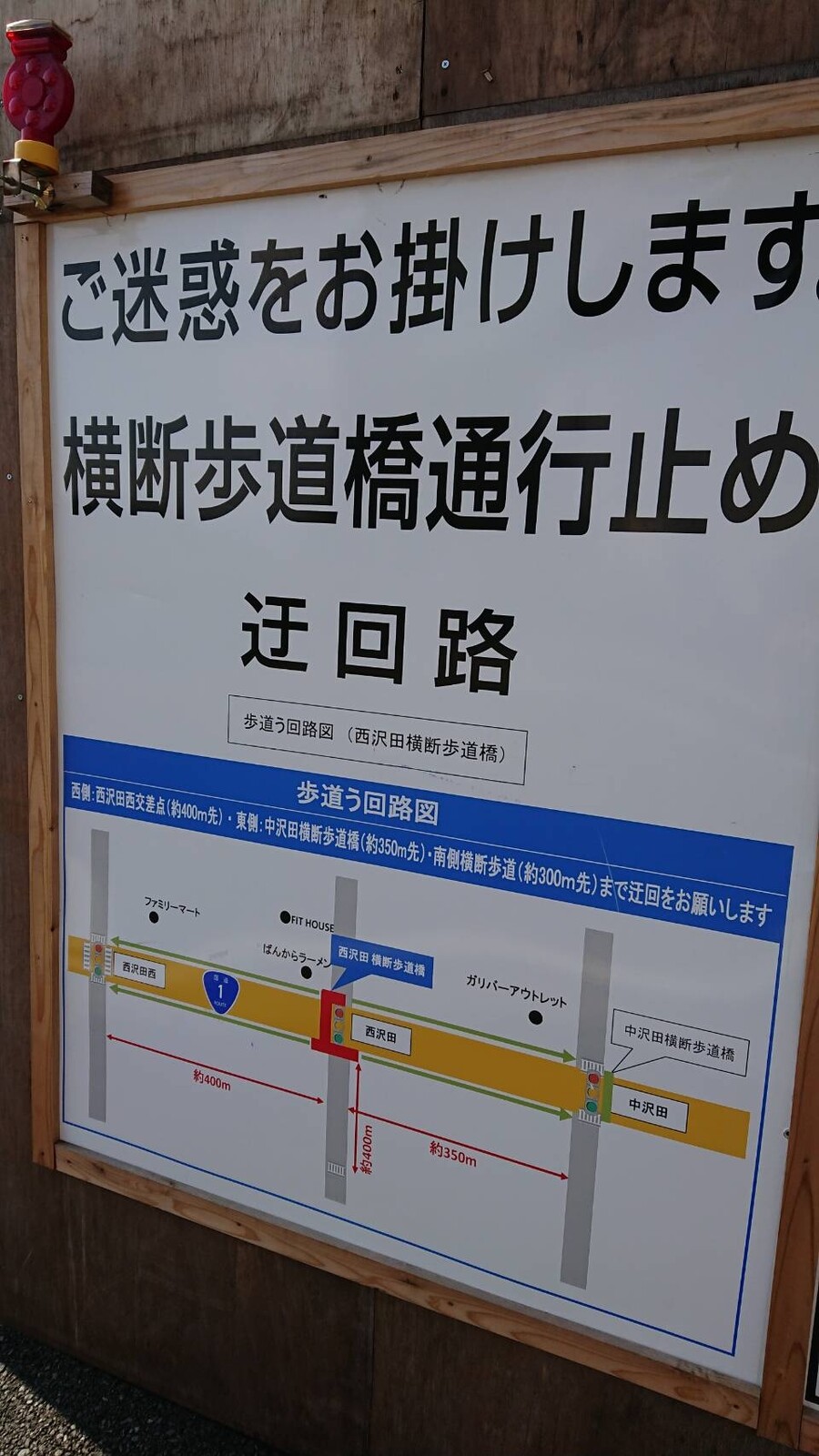 西沢田歩道橋の迂回路ですよ―。の看板があった。