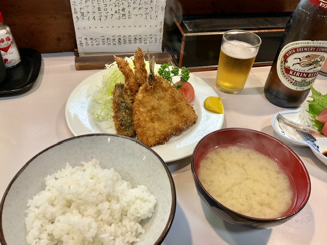 弥次喜多定食(魚フライとお刺身)と瓶ビールお願いします!