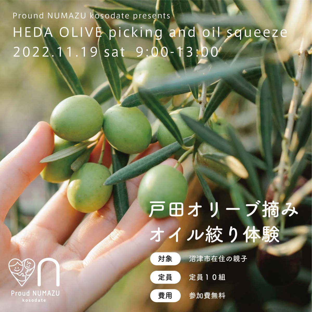 戸田オリーブ摘み・オイル絞り体験は、proud NUMAZU kosodateの主催なんだそう。