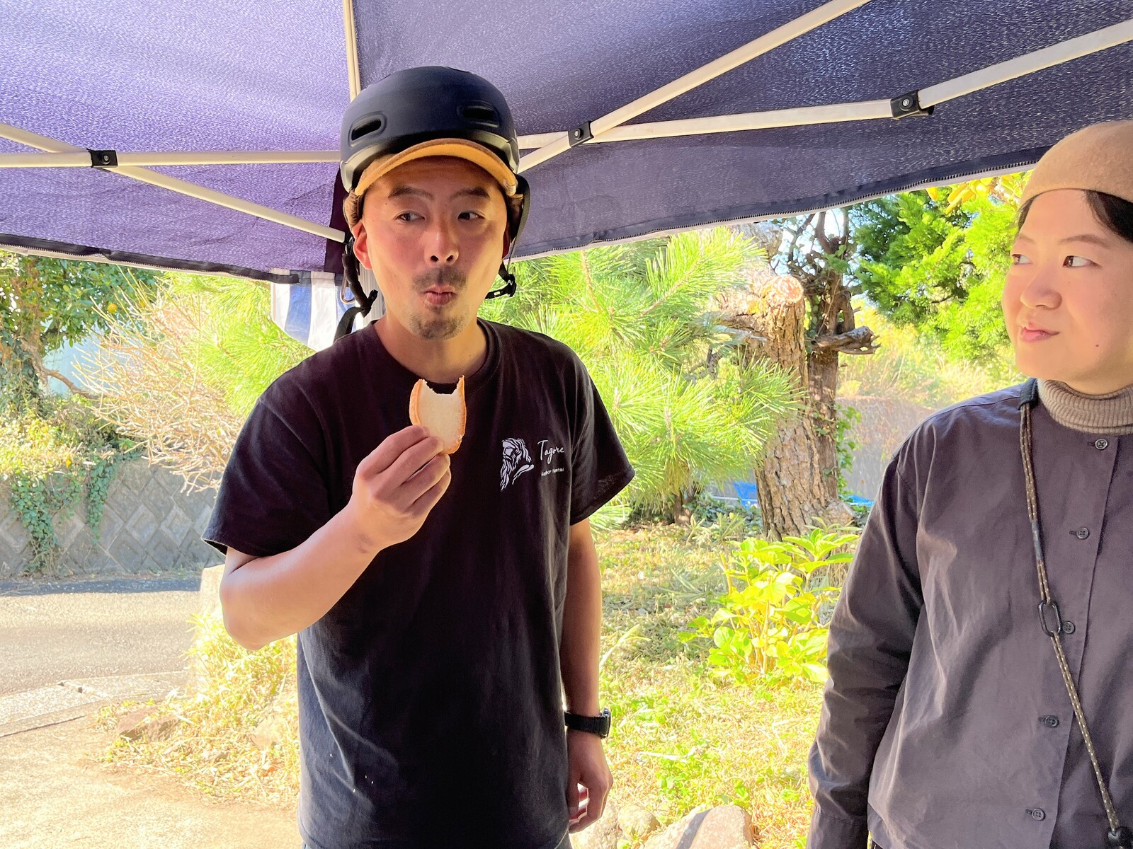 ちょうど試食のときに電動キックスケートで現れたしまやん。タイミングのいい男。