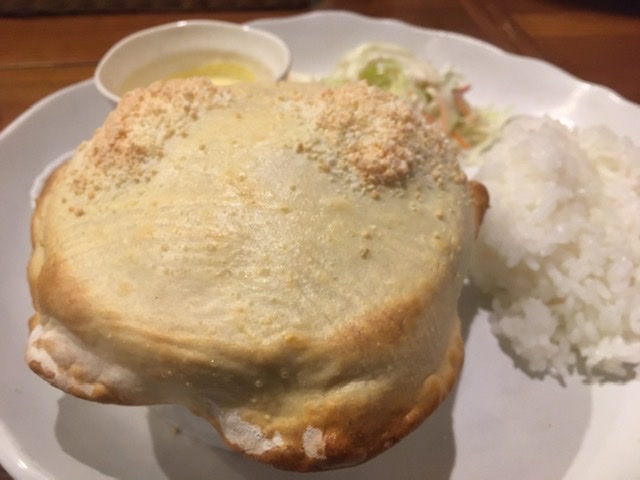 「パン包み」か「パイ包み」をスプーンでアレしているところでしょう。モチっ派か、サクっ派か。包み焼きの中はシチュー、グラタン、クリームソース煮、カレーなどからチョイスできる。