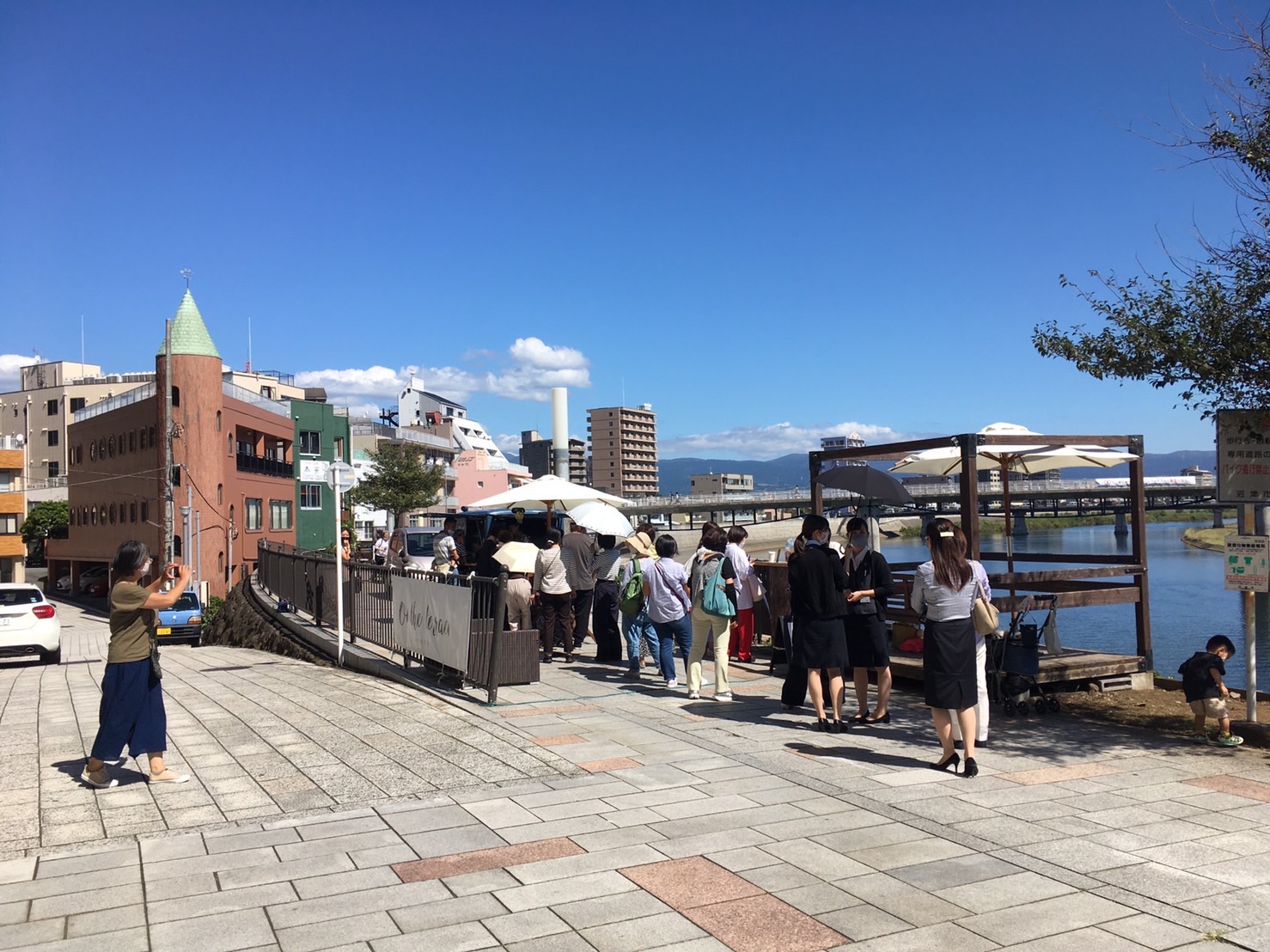 沼津駅から徒歩10分かからないぐらいの狩野川。沼津蒸留所とかあるらへんを「かのがわ風のテラス」っていう。