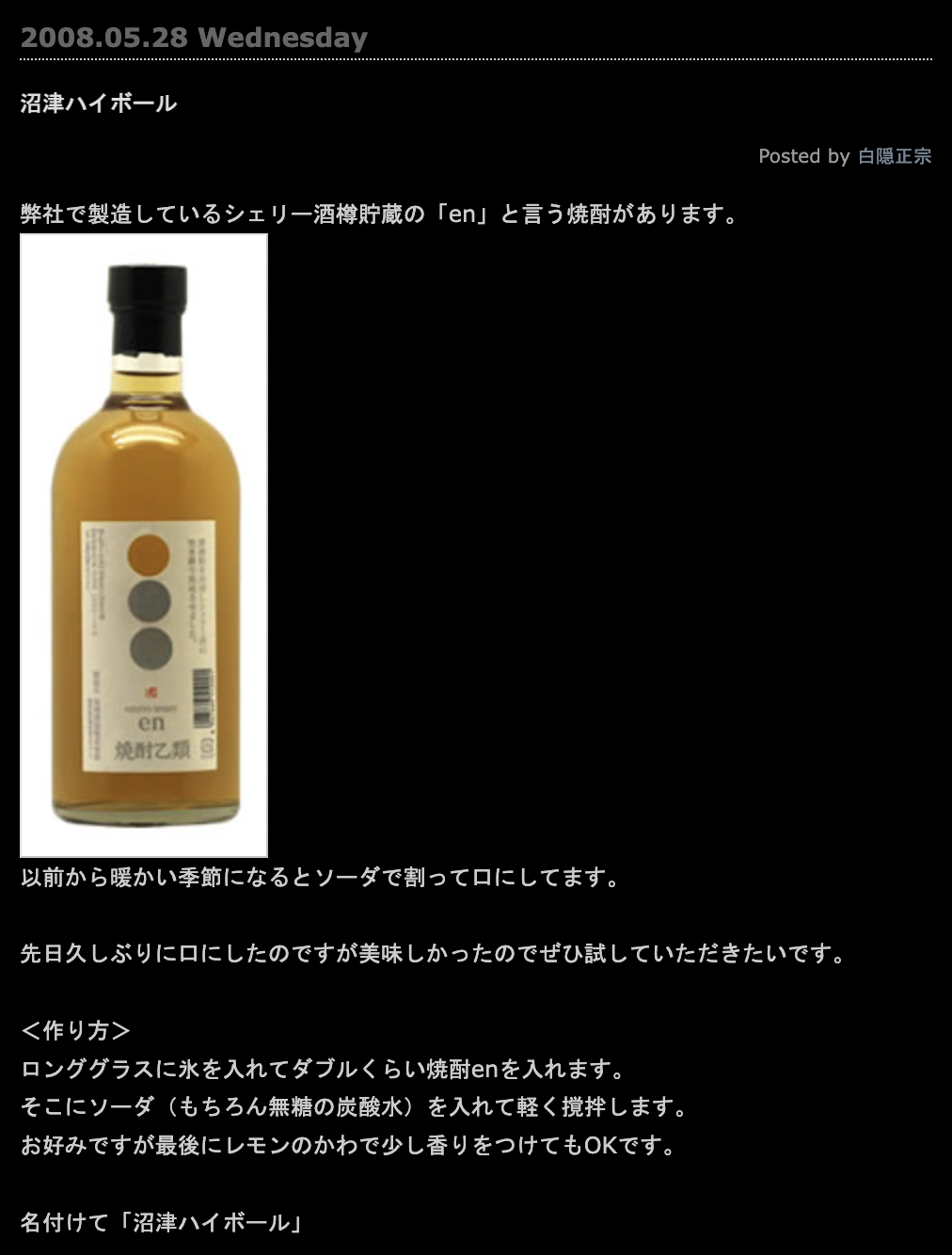調べると、白隠正宗をつくっている高嶋酒造の蔵元日記がでてきました。シェリー酒樽で貯蔵された焼酎なのだそう。たしかに、ふんわりいい香り!