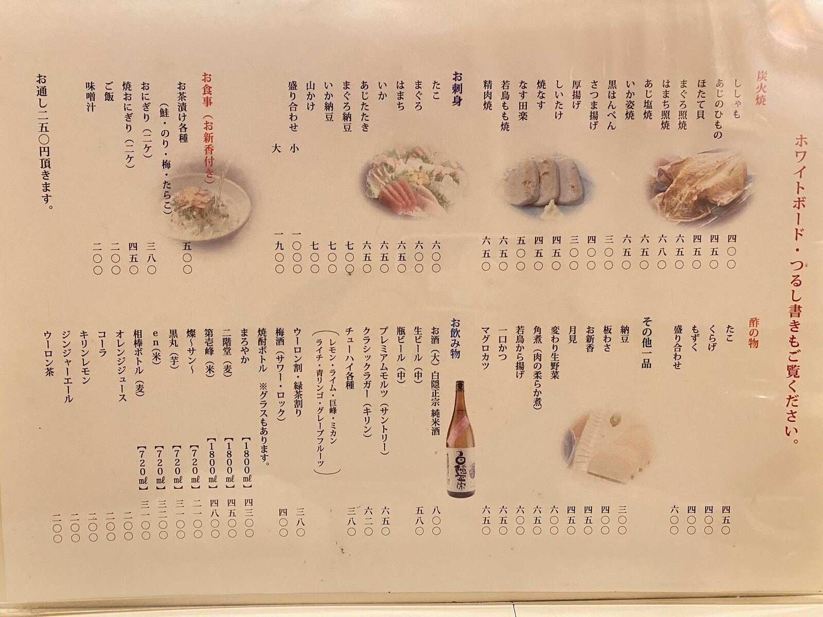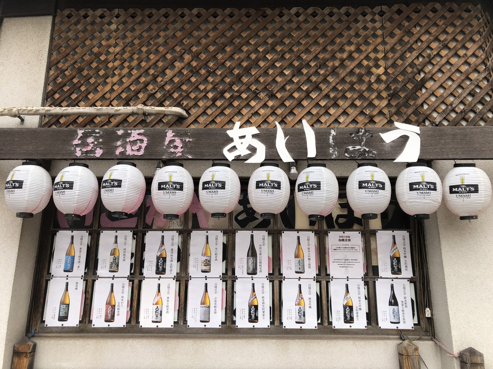 年季が入りすぎて、店名がもう読めない。その下には沼津の地酒「白隠正宗」のいろんな種類の写真たち。