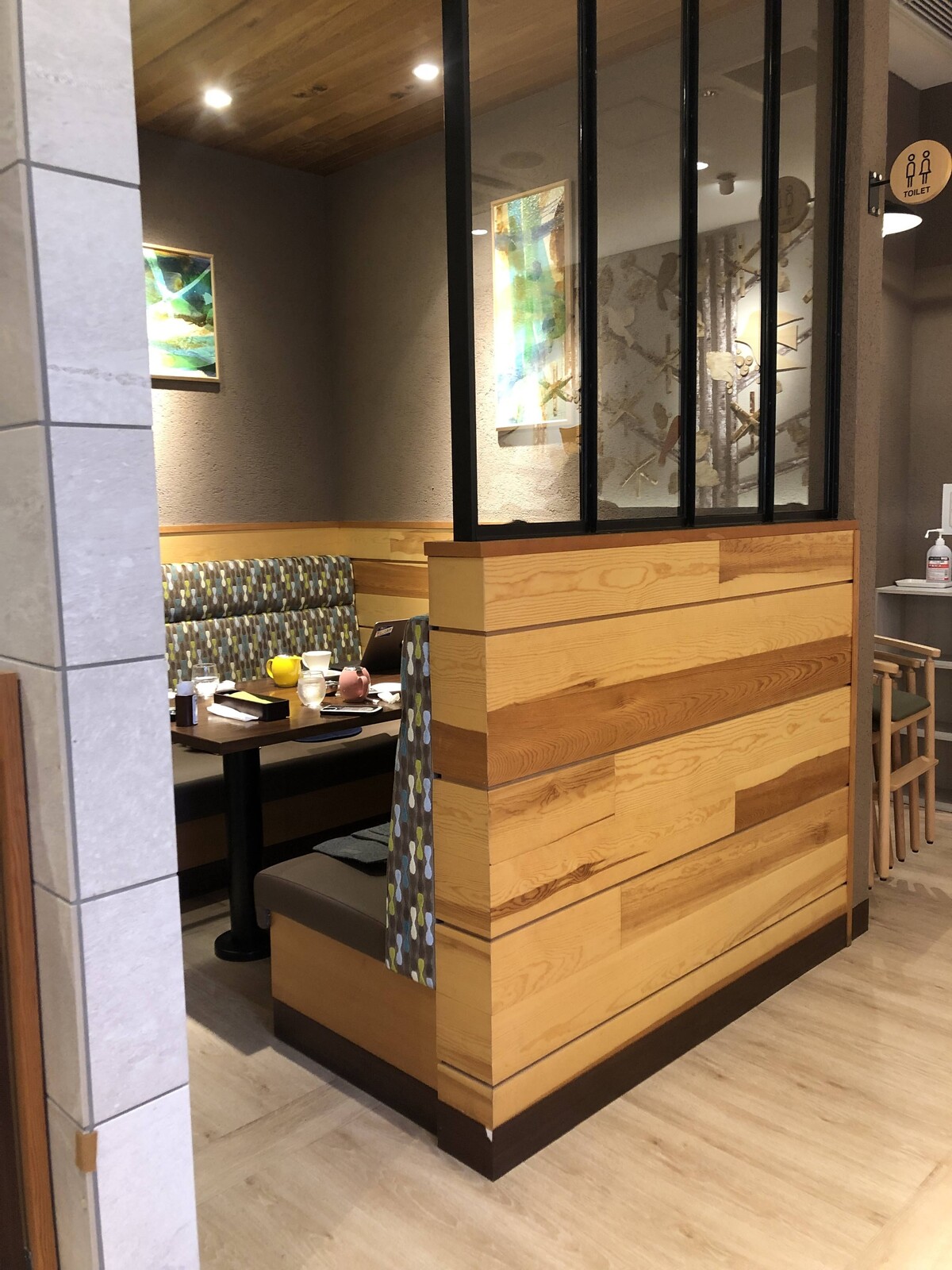 集中して仕事したいときとか打ち合わせをするときには、壁で仕切られたボックス席がおすすめ。小さい子どもと一緒のときにもいいかも。トイレの手前にあるよ。