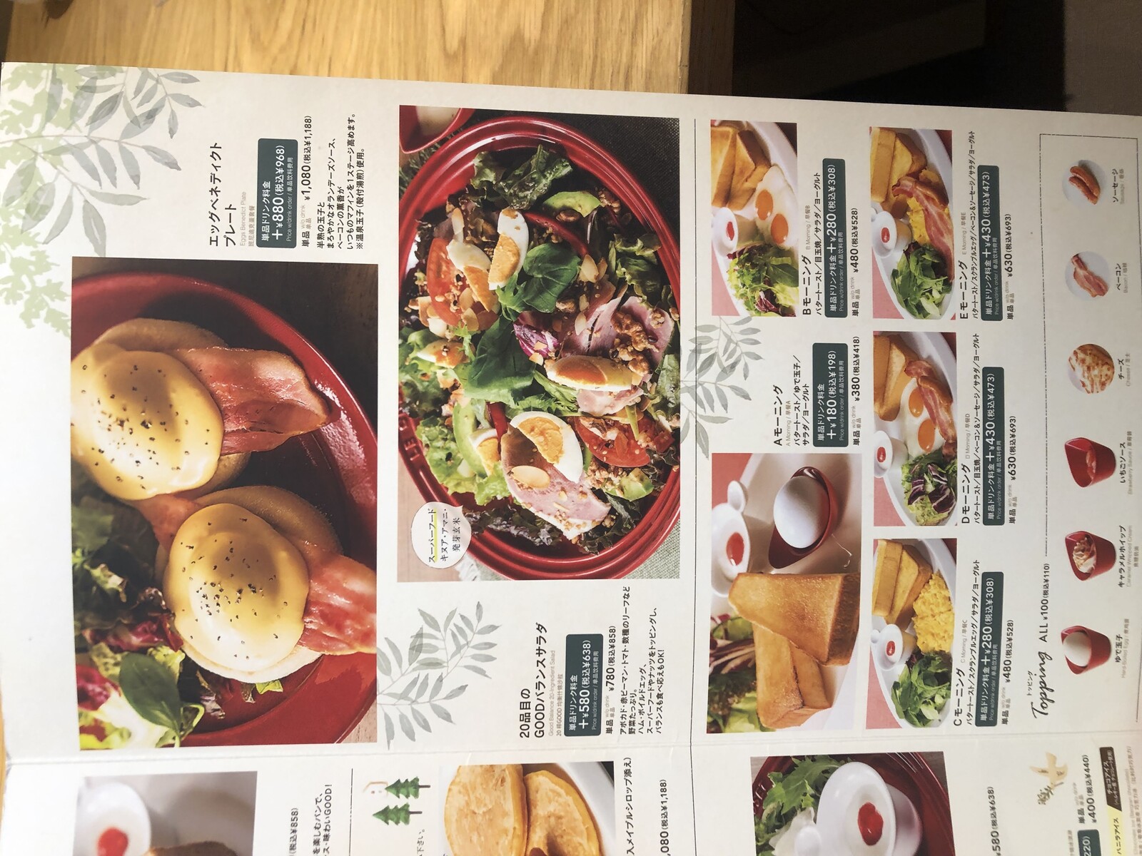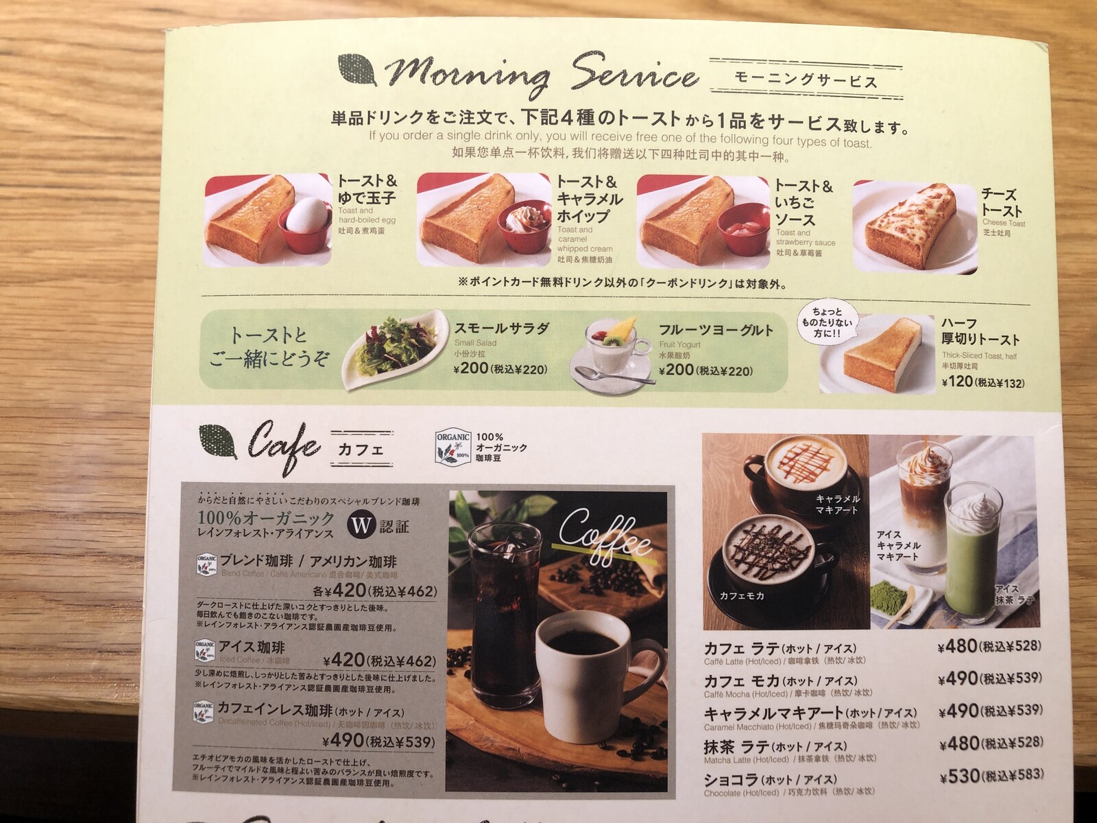 例えば、単品ドリンク料金 +280円 (税抜) でバタートースト、目玉焼、サラダ、ヨーグルトとか、