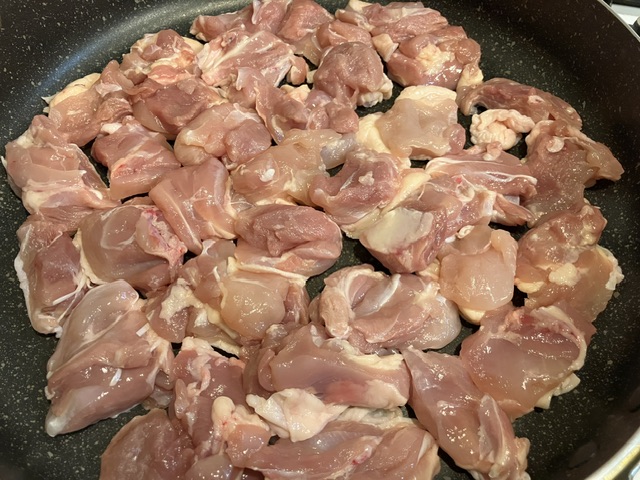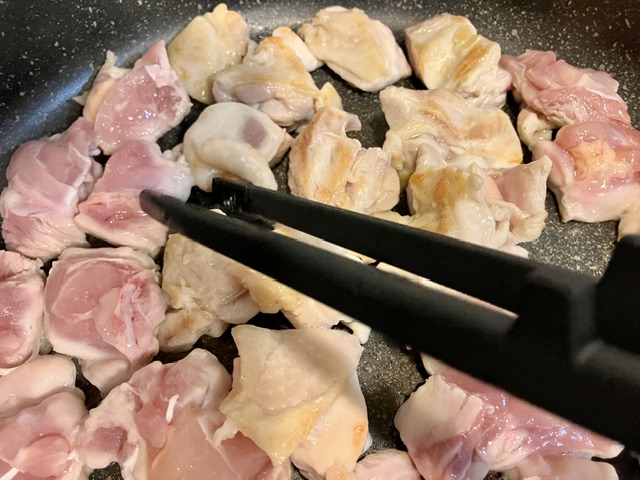 冷たいフライパンに鶏もも肉を皮を下にして並べ、中火で焼いていきます。