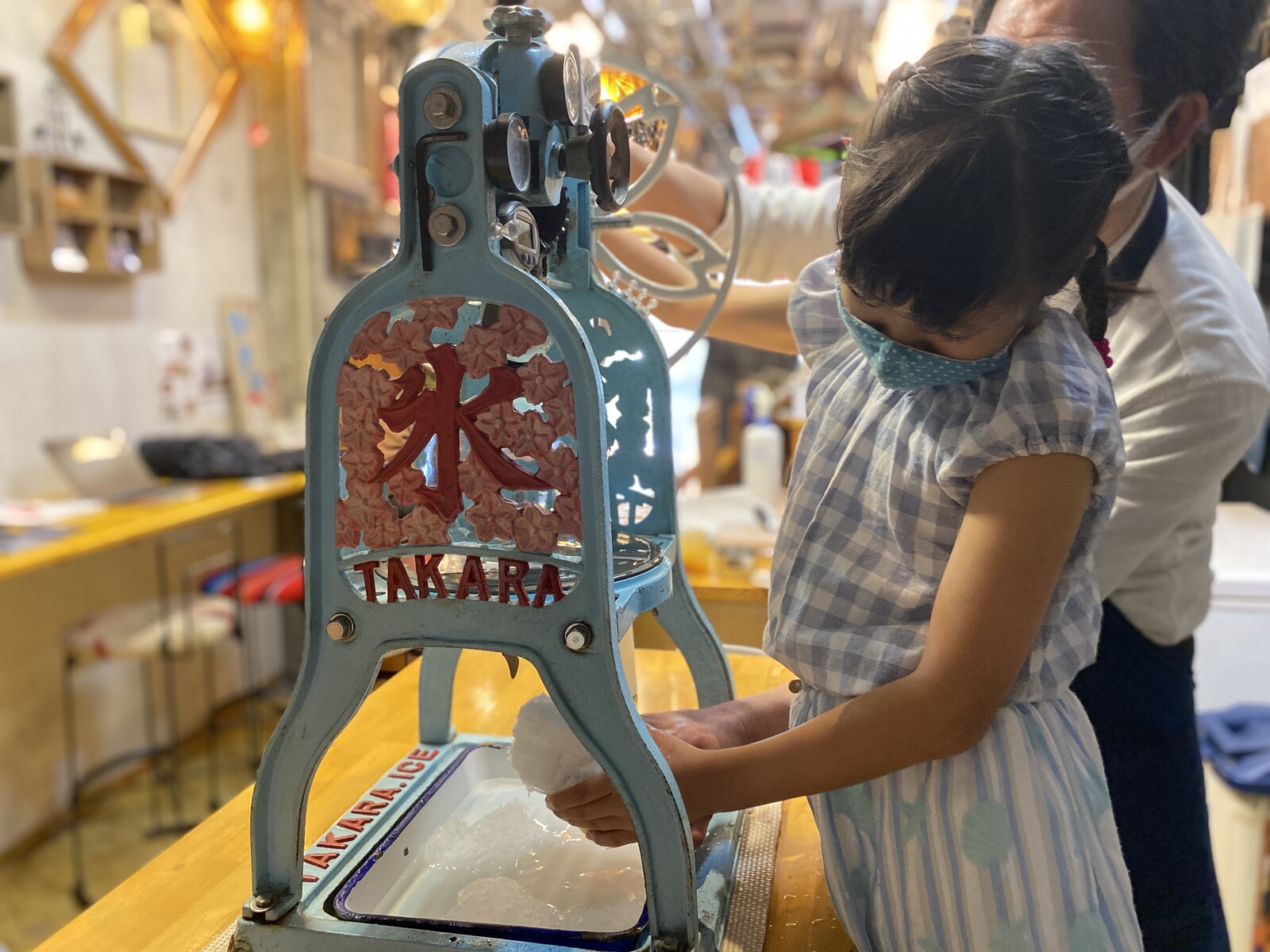ノリさんと一緒に、カキ氷機で氷を削ります。