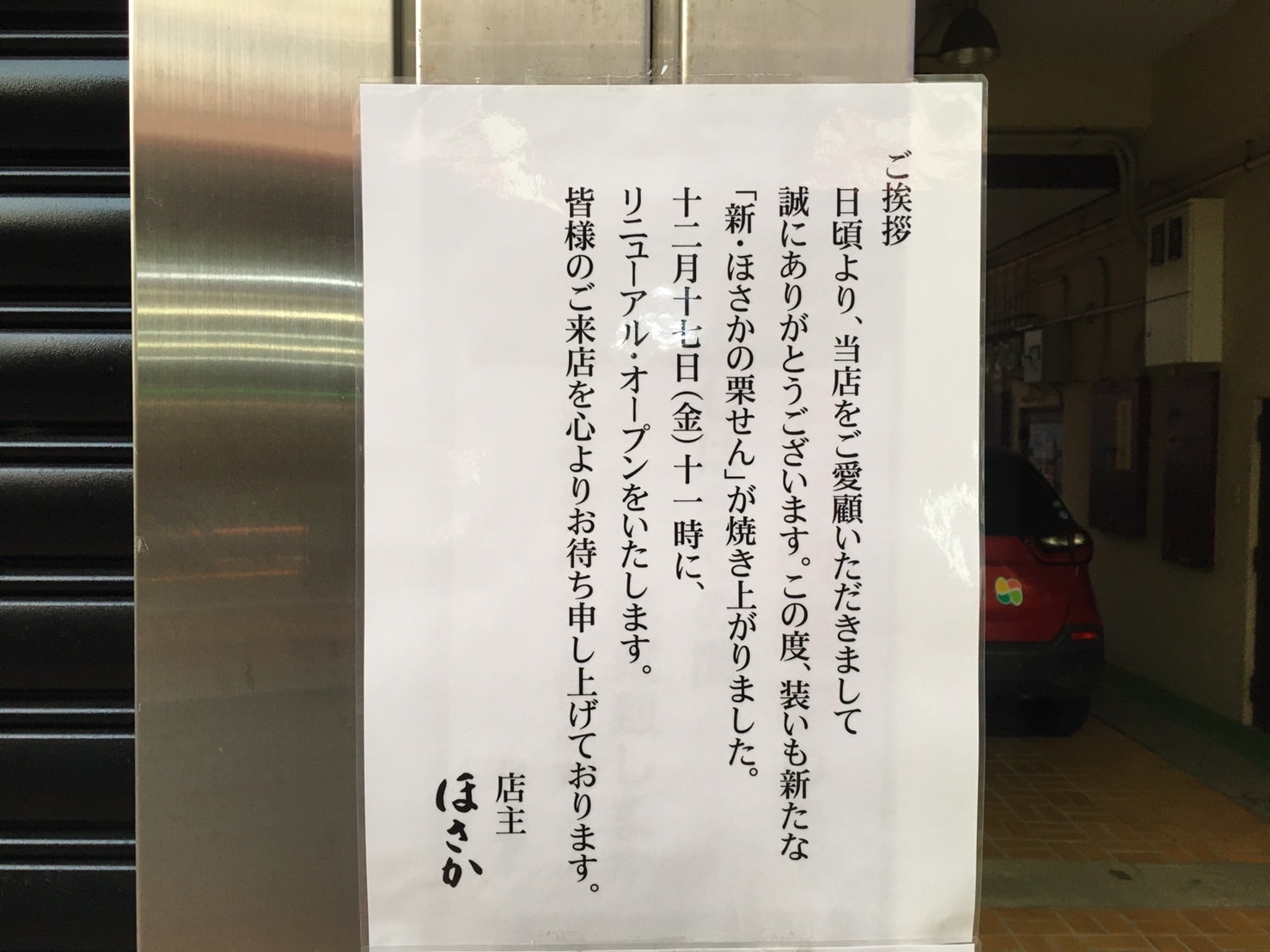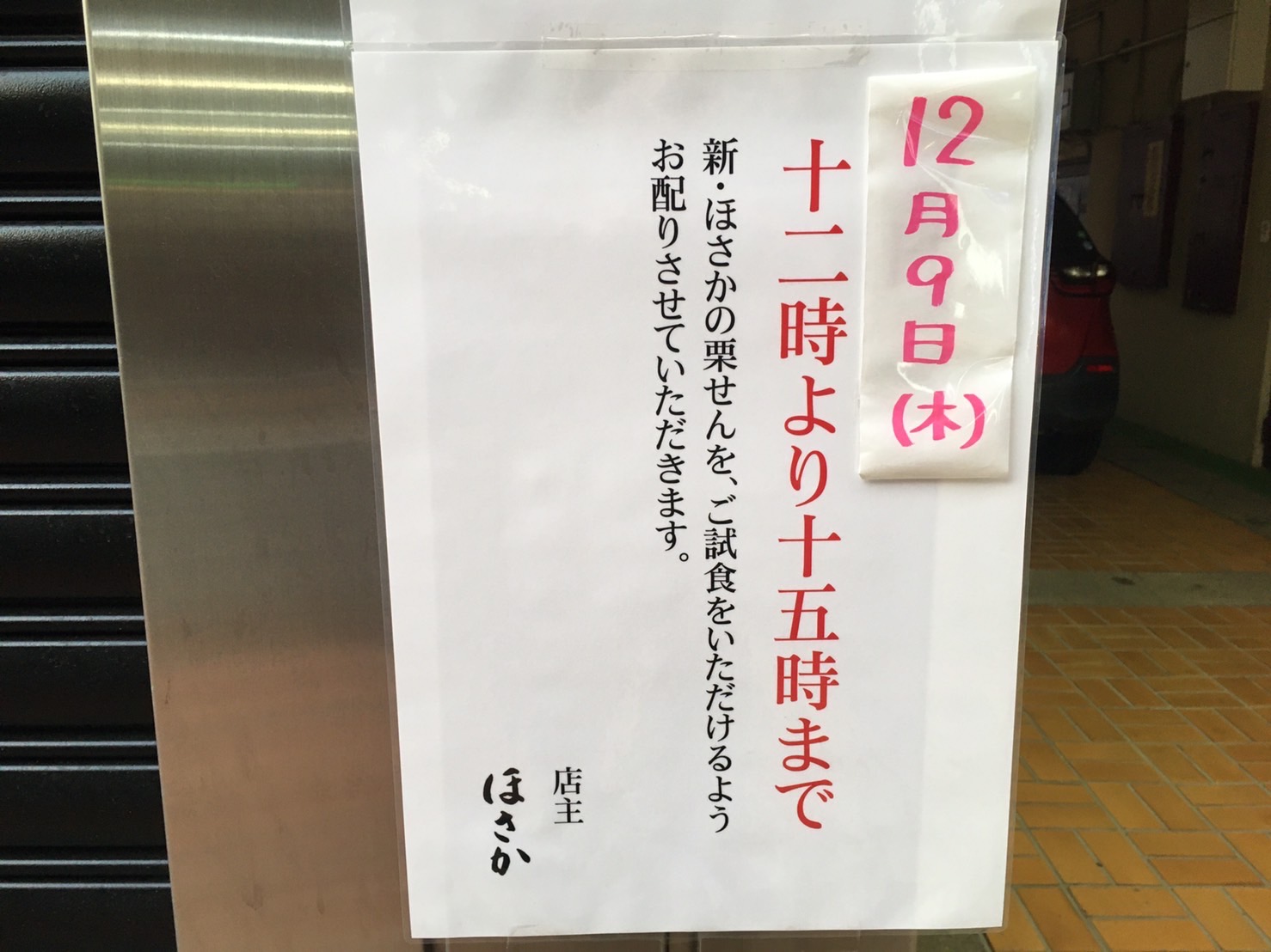 「12月9日(木)十二時より十五時まで 新・ほさかの栗せんを、ご試食をいただけるようお配りさせていただきます。店主ほさか」の張り紙を発見!