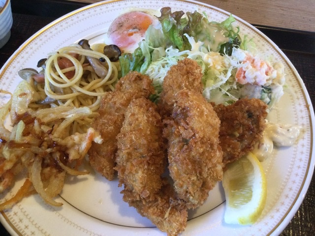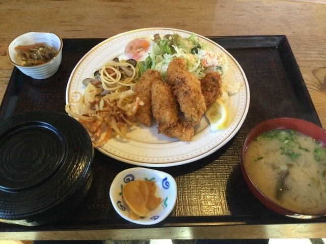 でっかいカキが5粒、野菜フライや小鉢、デザートまでついて大満足。