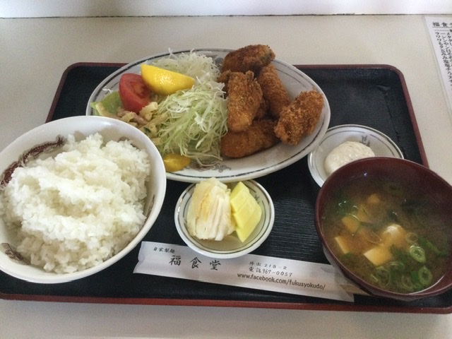 井出にある福食堂の牡蠣フライ定食980円也。ラーメン屋さんでカキフライ定食って珍しいですが、