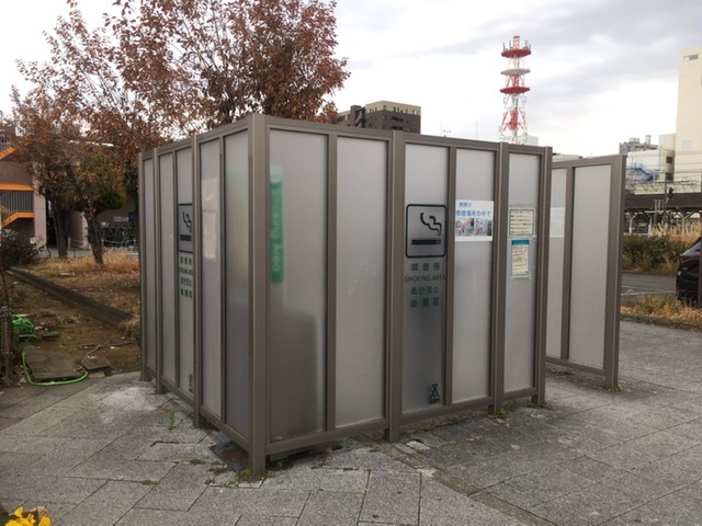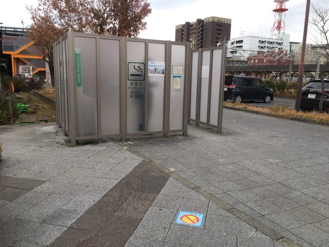 線路の向こうにはNTT沼津ビルが見える。どこかに行っていて電車で沼津駅に着いてこの塔をみると「帰ってきた感」がある。この中でどうぞの張り紙。まわりに吸い殻は落ちていなかった。 喫煙は決められた場所で。