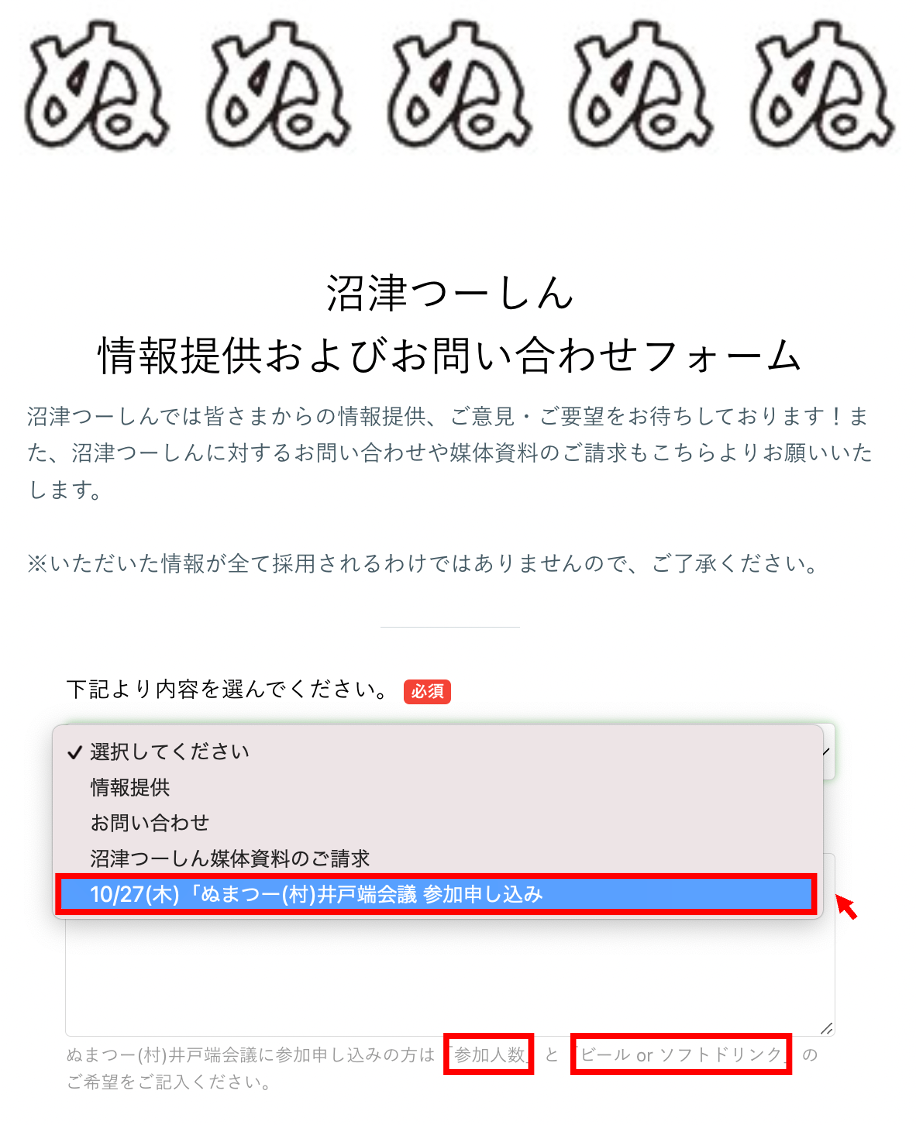 こちらから 10/27(木) 「ぬまつー(村) 井戸端会議 参加申し込み を選んで、内容のところに参加人数とお酒orソフトドリンクのご希望を記入してね。