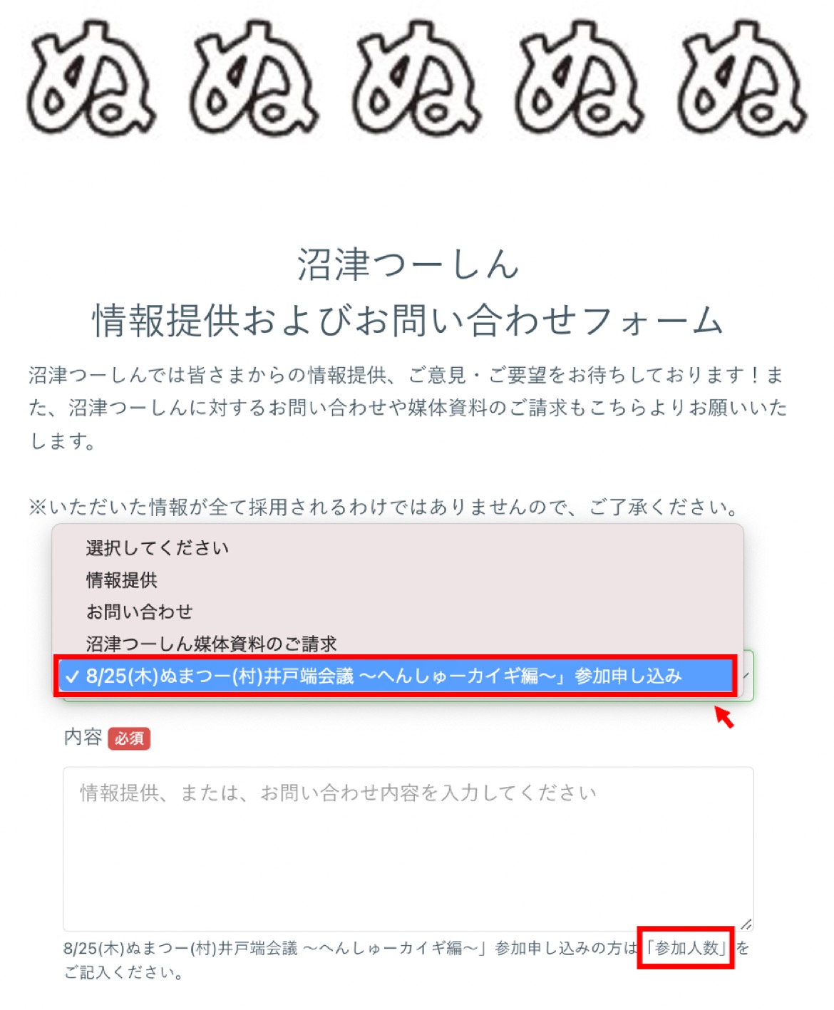 こちらの情報提供フォームで 8/25(木) ぬまつー(村) 井戸端会議〜へんしゅーカイギ編〜 参加申し込み を選んで、内容に参加人数を記入してください。