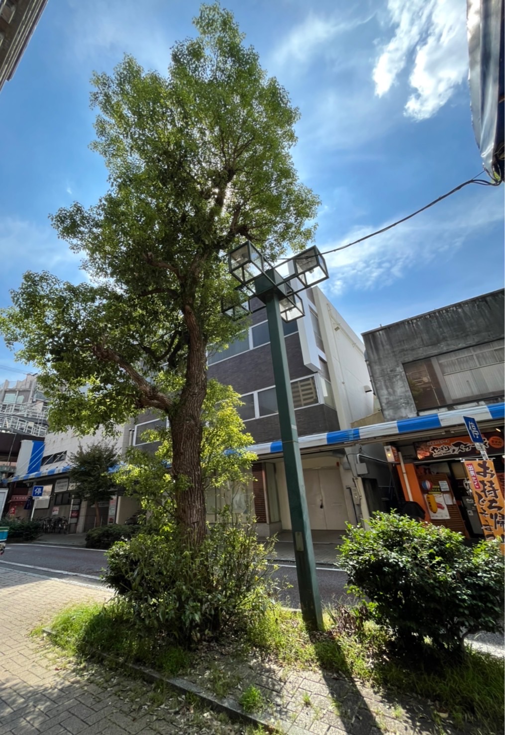 低木の植栽が互い違いに両側にあったり、ビルの2階くらいあたりまでの高さの高木があったり。
