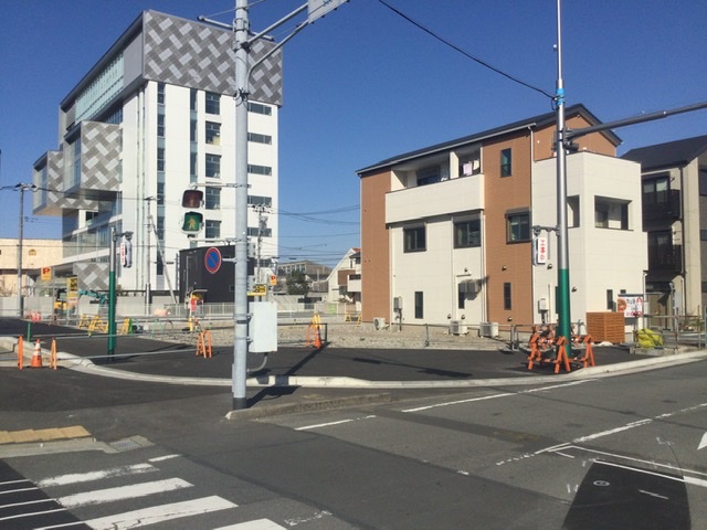 道路が拡幅されて、交差点が広くなるみたいですね。今のところ、歩行者用信号しかついてないみたいですが、そのうち車両用の信号もつくんでしょうね。