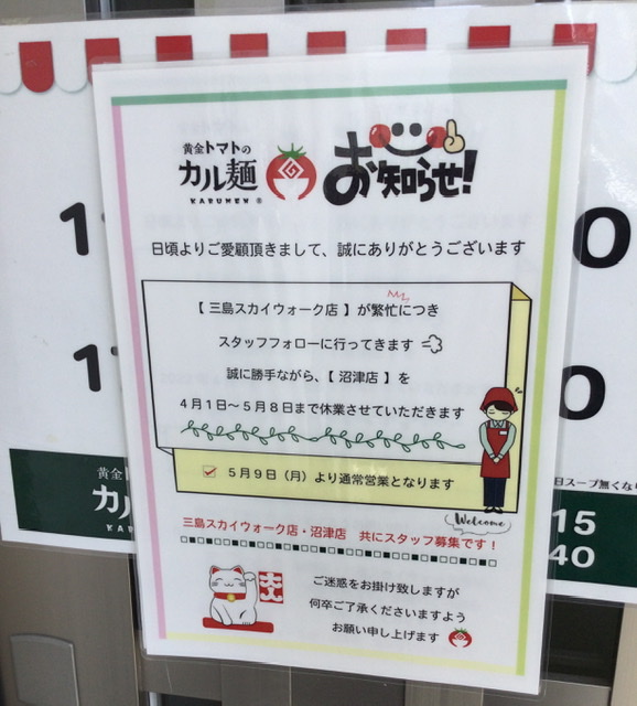 中央亭の様子を見に行ったとき、お向かいのカル麺が休業中との掲示を目にしました。