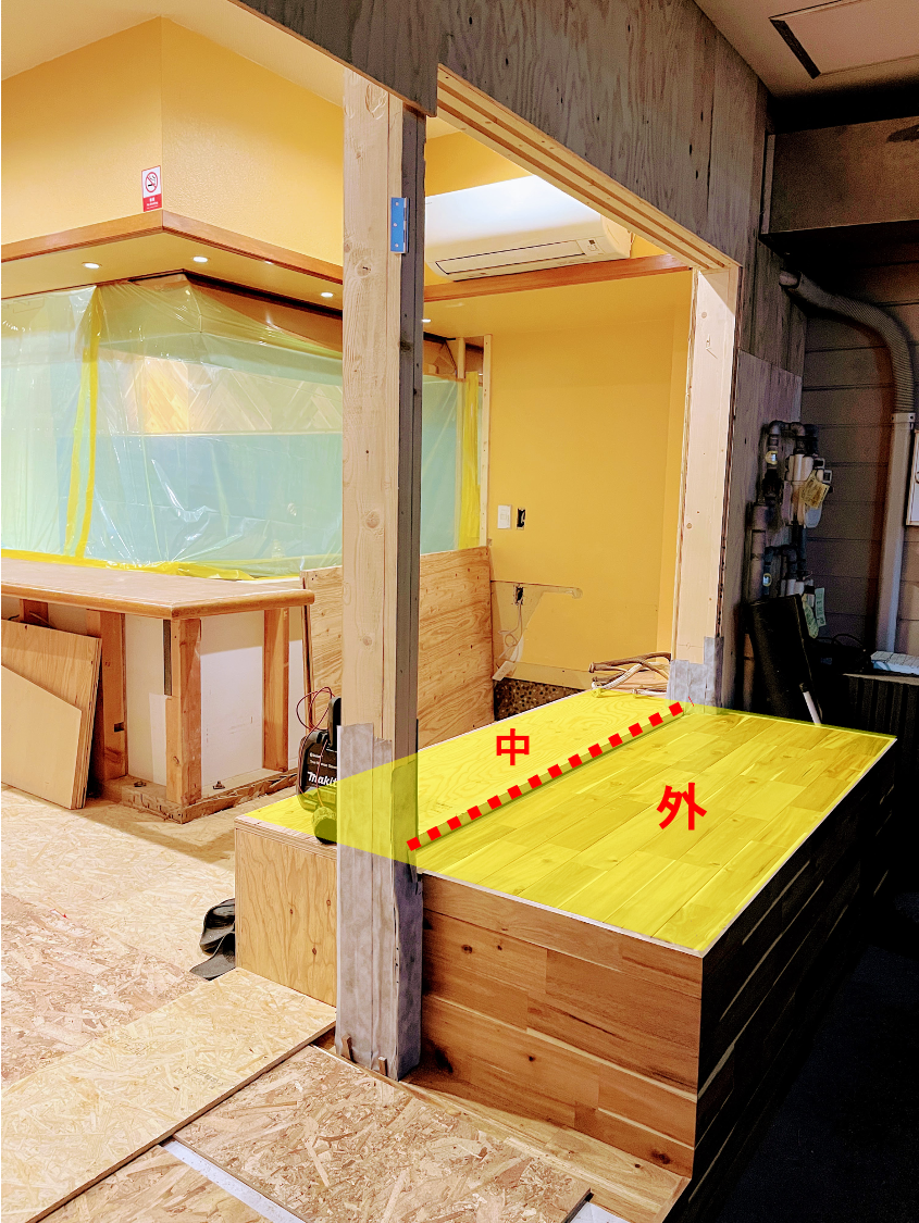 表と店内がフラットにつながるベンチがあって、そこに大きな扉がつくみたいなんだけど、今回はフルオープンに。