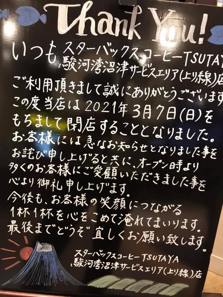 駿河湾沼津サービスエリア(上り)のスターバックスコーヒーTSUTAYAが3月7日で閉店するみたい【閉店情報】