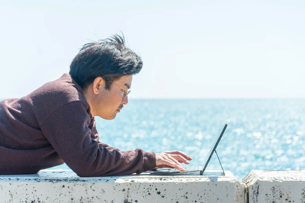 海辺でリモートワークをする西出さん。こんな自由な会社員もいるんですね。(写真は西出さん提供)