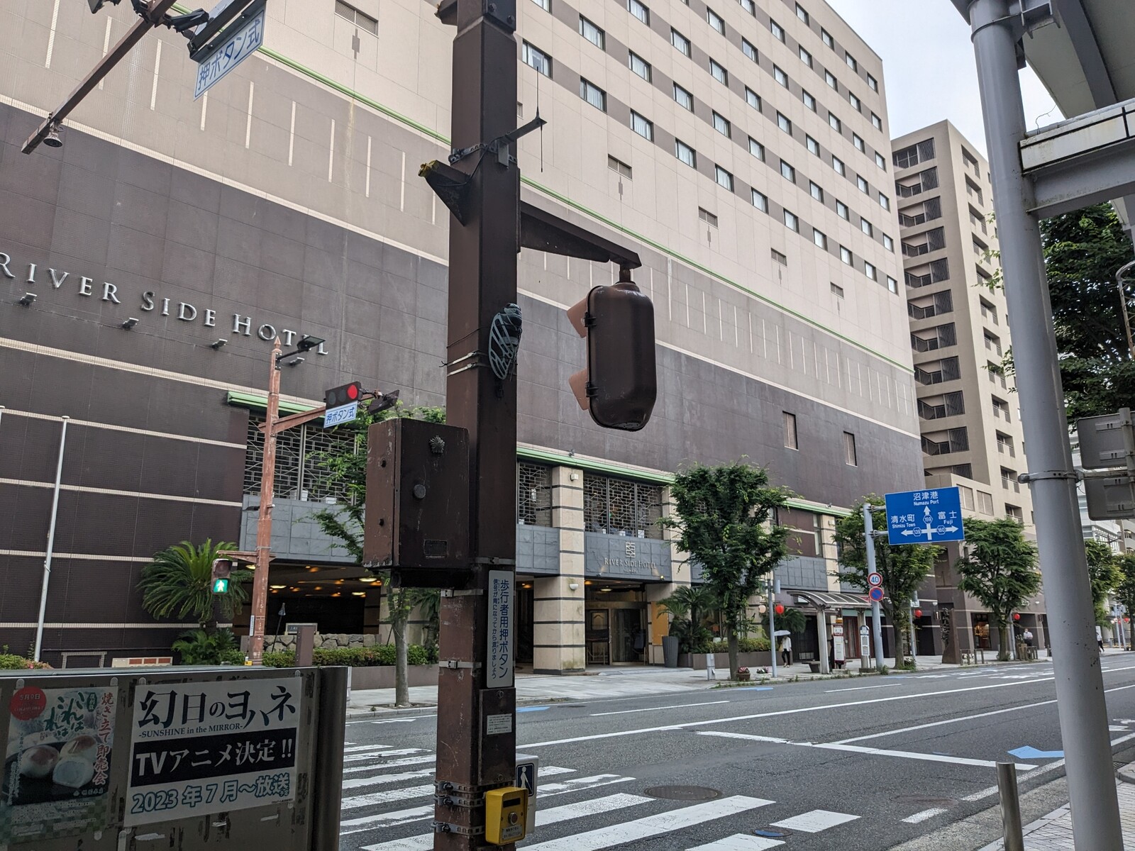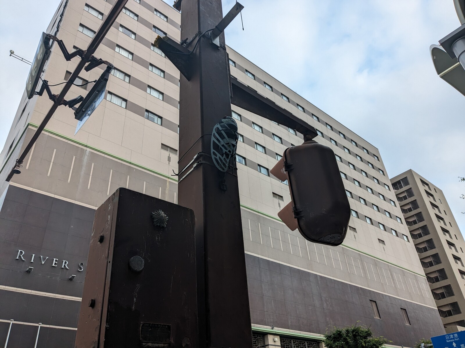 の、隣にある沼津リバーサイドホテルの目の前の信号機に