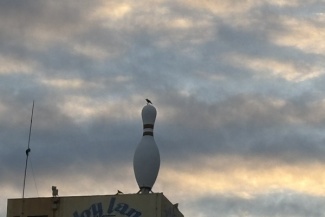 - ジョイランドボウル宝塚。屋上のピンの上に、鳥いた。沼津を一望できる一番の特等席かもしれない。(沼津市大手町)