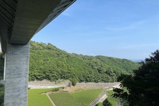 - あたりは緑の絨毯!浮島地区の茶畑がきれい。先日は茶摘み体験もやってた。