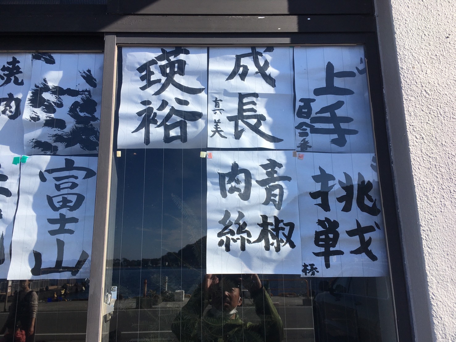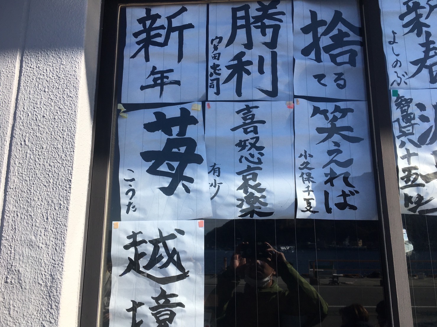ラウンジの書き初めコーナーで書いたみんなの抱負は窓にw
