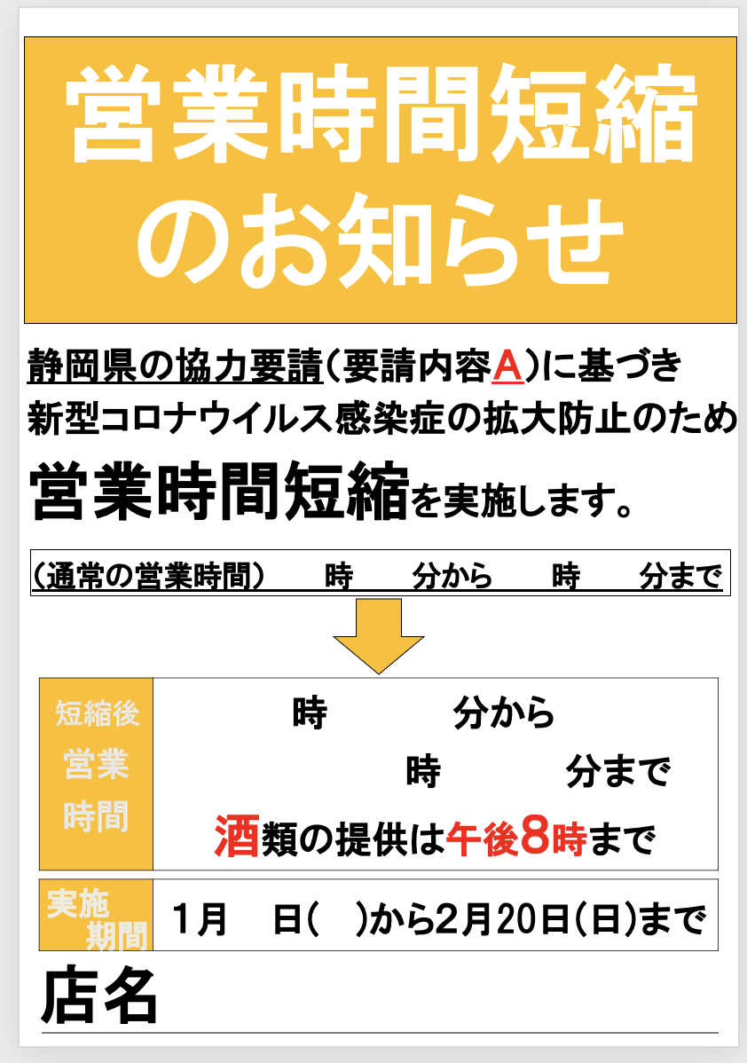 【1/27から】静岡県のまん延防止等重点措置に伴う飲食店への要請に関する情報が、公開されてる。