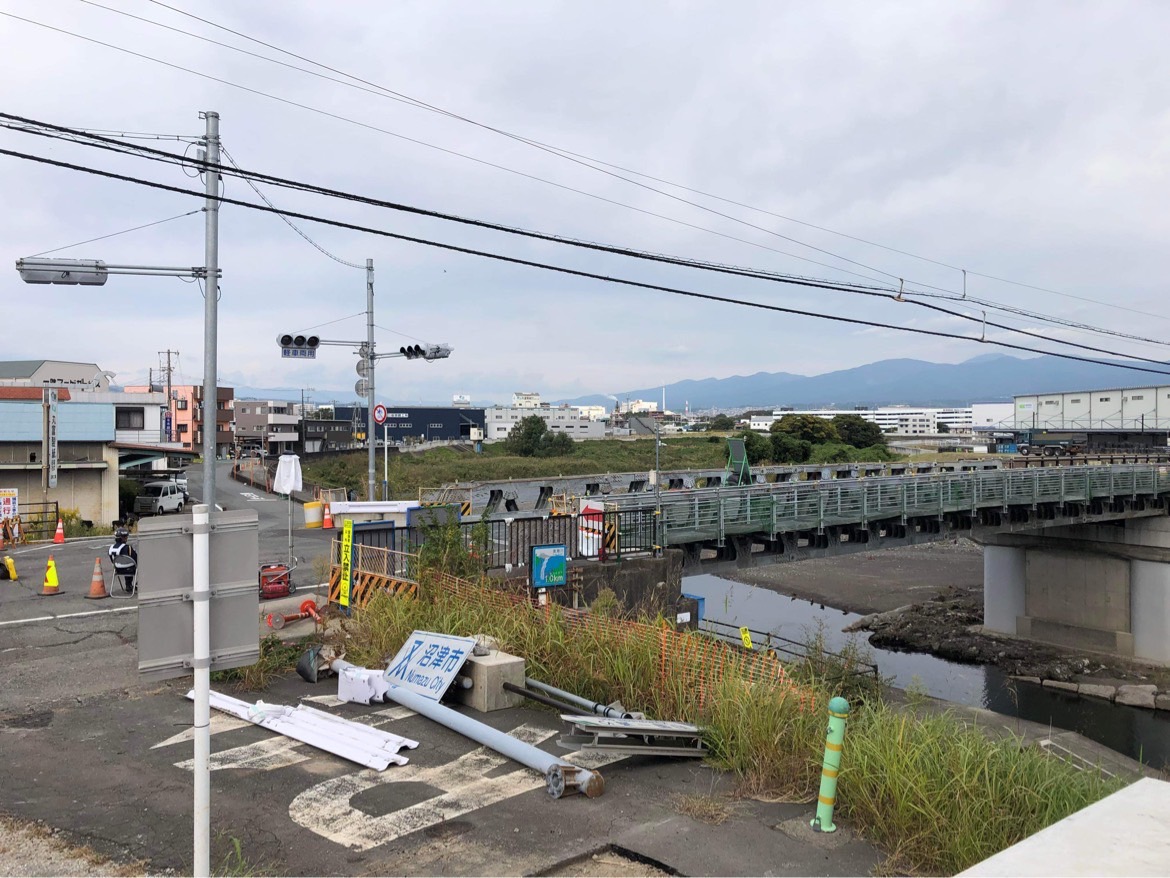 10/16(月)に開通してた駿東郡清水町に向かう黄瀬川大橋の仮橋を渡りに行ってみた。大型・中型車、二輪車の通行も可。(沼津市大岡)