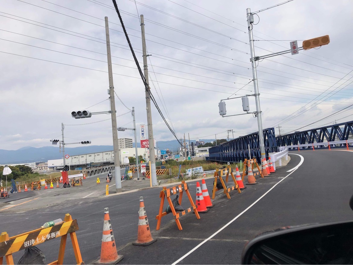 沼津市のホームページを確認してみたら、このたび、黄瀬川大橋の仮橋を10月16日(月曜日)15時に開通することになりました。仮橋の開通によって、大型・中型車、二輪車の通行も可能となります。って書いてあった。