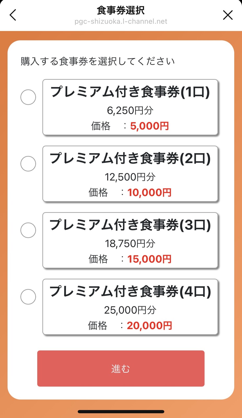 1分くらいで買えました。購入上限は1人あたり20,000円(食事券25,000円)。