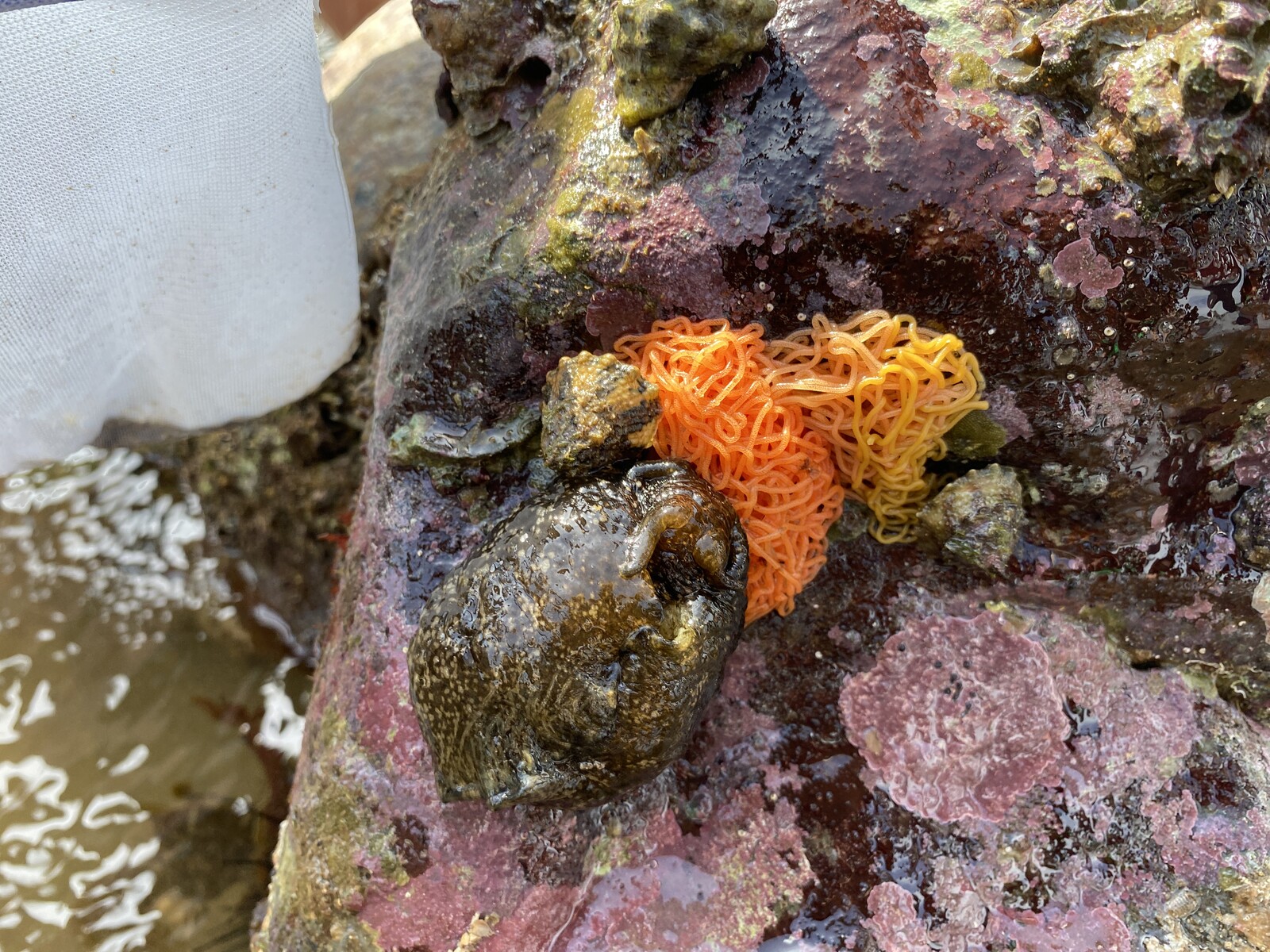オレンジ色のソーメンのようなものが卵です。なんと、産んだばかりの卵を、さっそく貝が食べている!