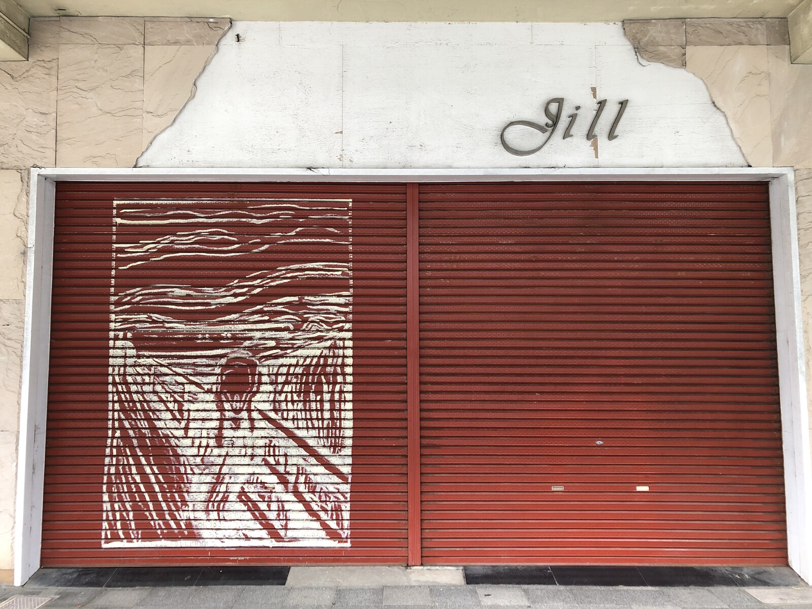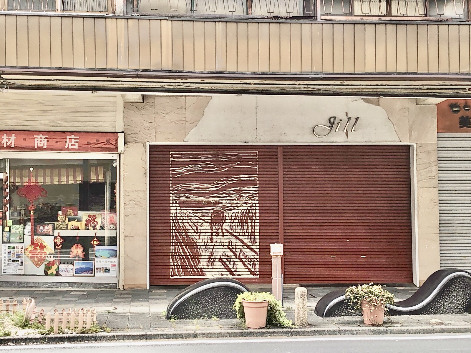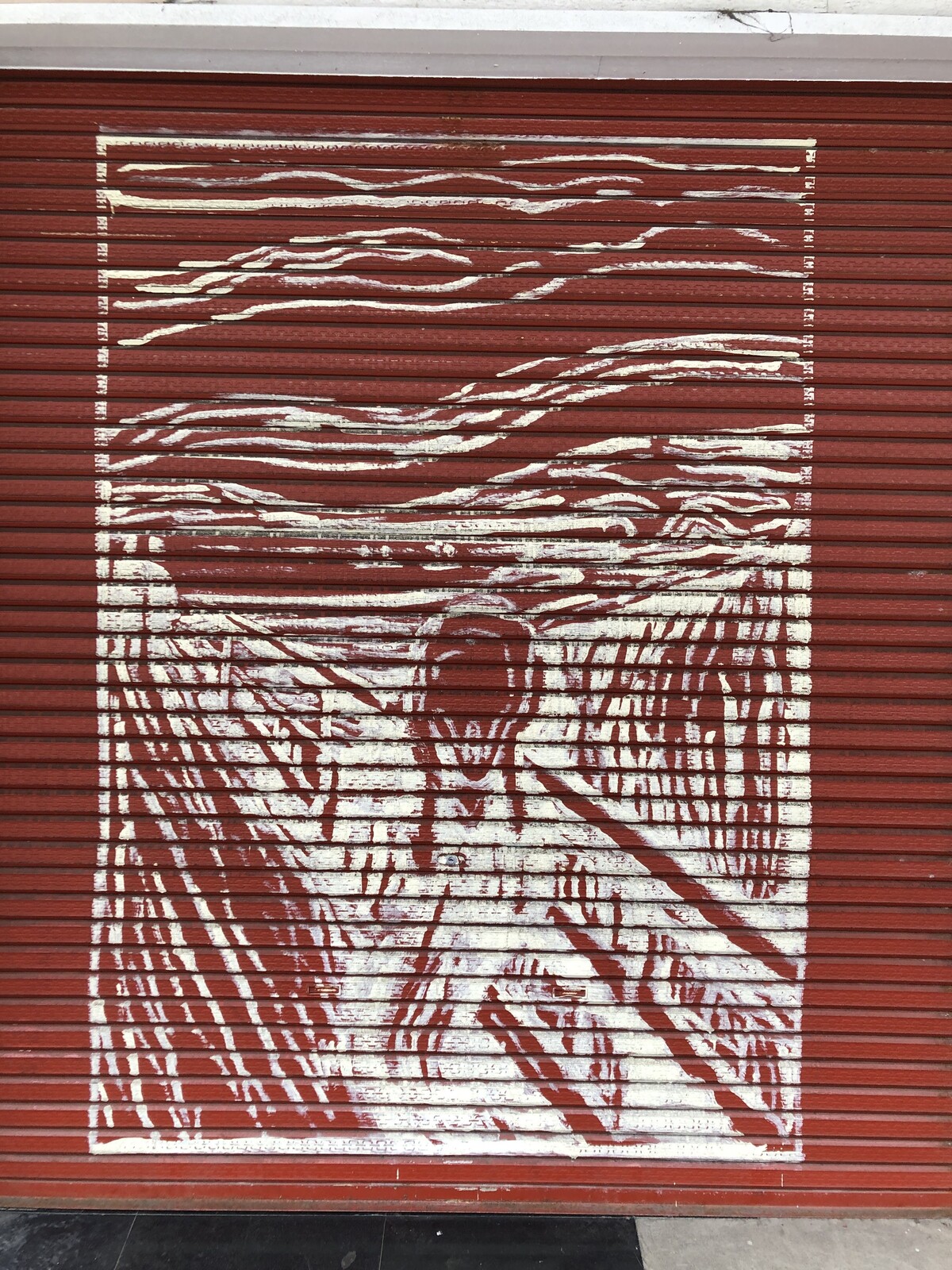 アーケード名店街のシャッターアート。ムンクが叫んでる。