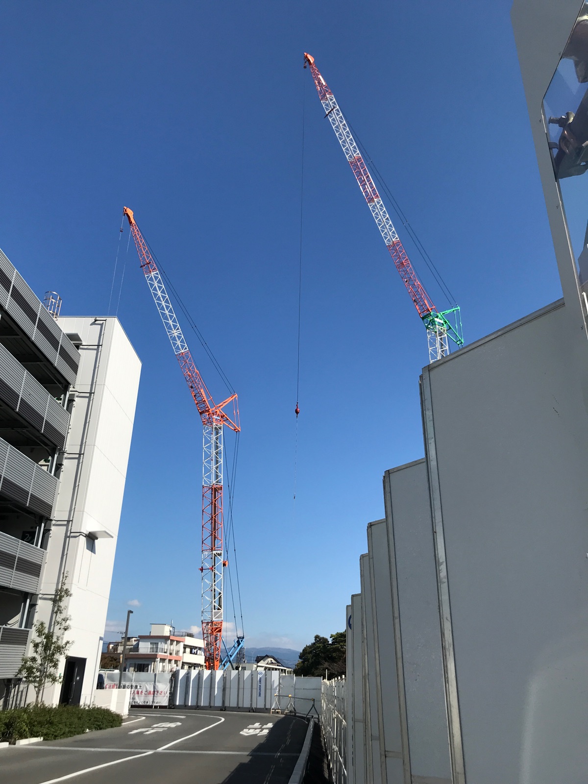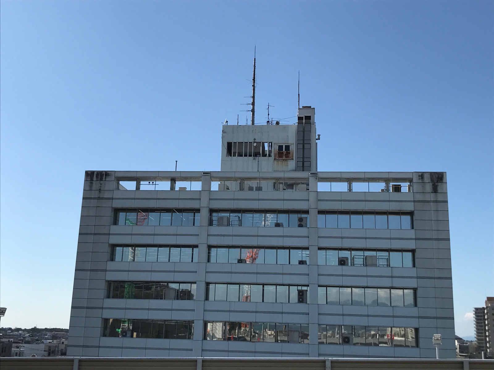 沼津市役所の窓にも 重機がちょっと映り込んでいて