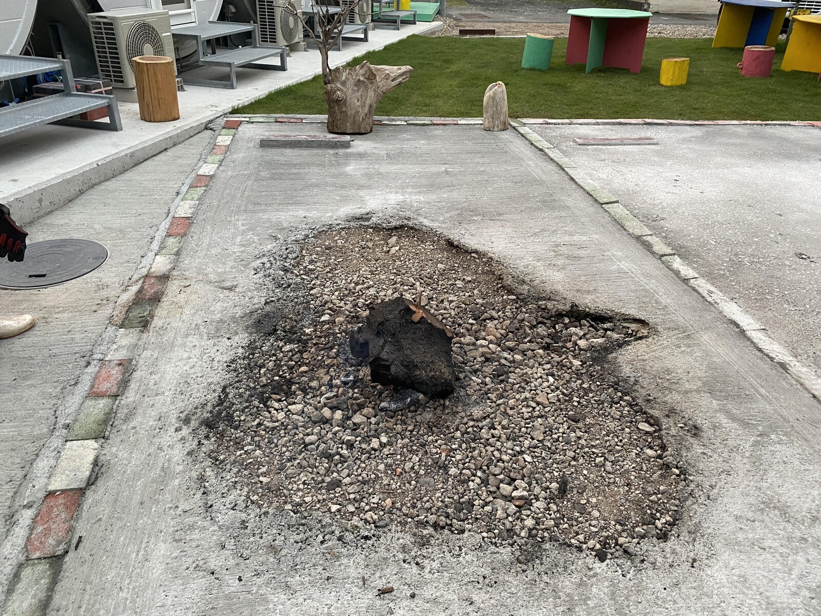 その間に、コンクリートをこの場所に流し込む作業があったらしく、このスウェーデントーチの跡がくっきり残ってる。え?そのままやっちゃったの?
